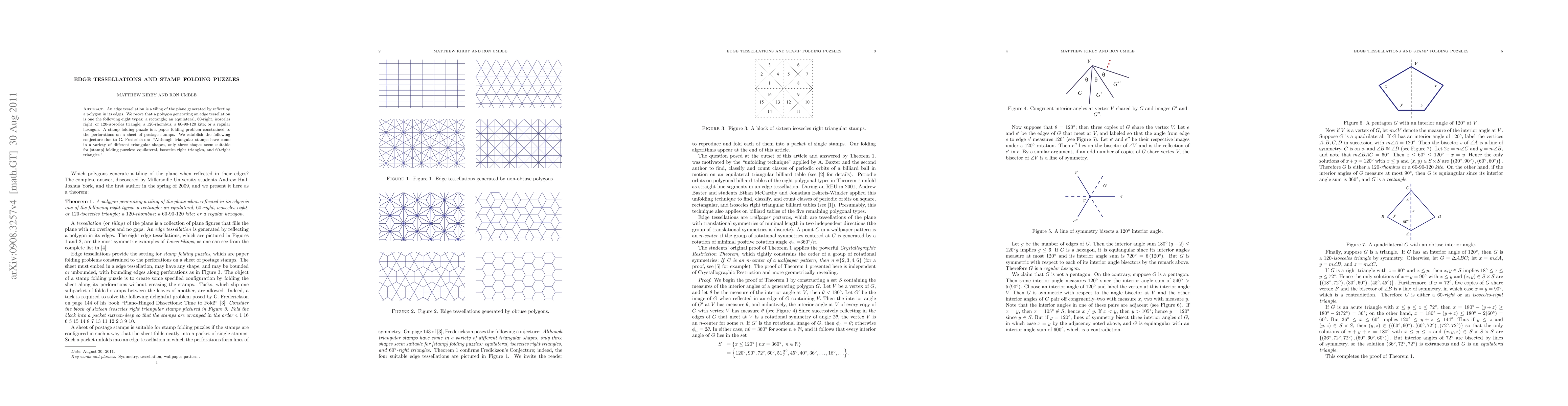 An edge tessellation is a tiling of the plane generated by reflecting a polygon in its edges. We prove that a polygon generating an edge tessellation is one the following eight types: a rectangle; an equilateral, 60-right, isosceles right, or 120-isosceles triangle; a 120-rhombus; a 60-90-120 kite; or a regular hexagon. A stamp folding puzzle is a paper folding problem constrained to the perforations on a sheet of postage stamps. We establish the following conjecture due to G. Frederickson: "Although triangular stamps have come in a variety of different triangular shapes, only three shapes seem suitable for [stamp] folding puzzles: equilateral, isosceles right triangles, and 60-right triangles."