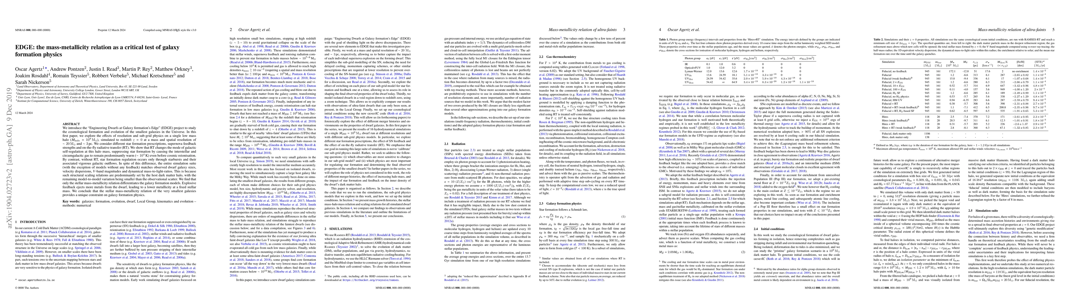 The EDGE project investigates the formation of small galaxies, finding that radiative transfer alters star formation regulation by keeping gas warm, while simulations match observed structural properties. The stellar mass-metallicity relation emerges as a critical test of galaxy formation physics, with feedback mechanisms influencing metallicity.