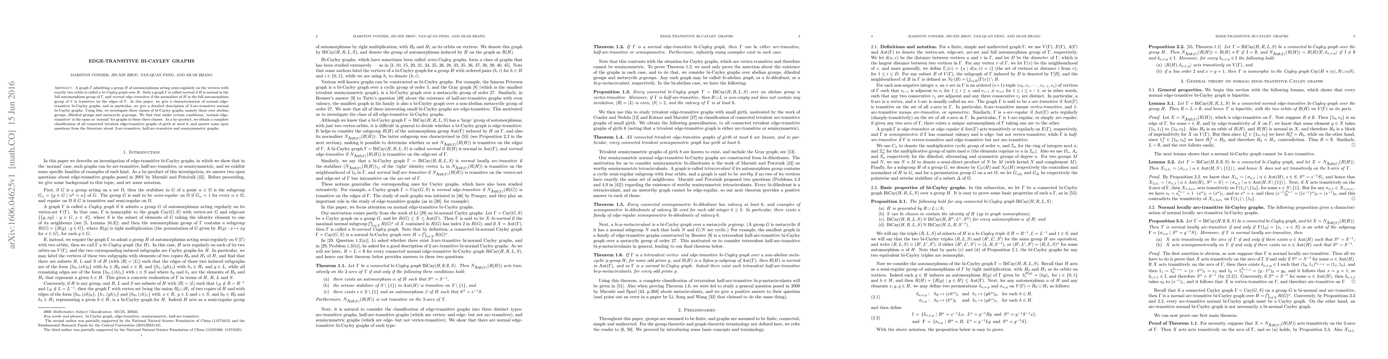 This paper characterizes normal edge-transitive bi-Cayley graphs, focusing on $2$-arc-transitive instances and exploring classes over abelian, dihedral, and metacyclic $p$-groups. It concludes with a complete classification of connected trivalent edge-transitive graphs with girth at most 6.