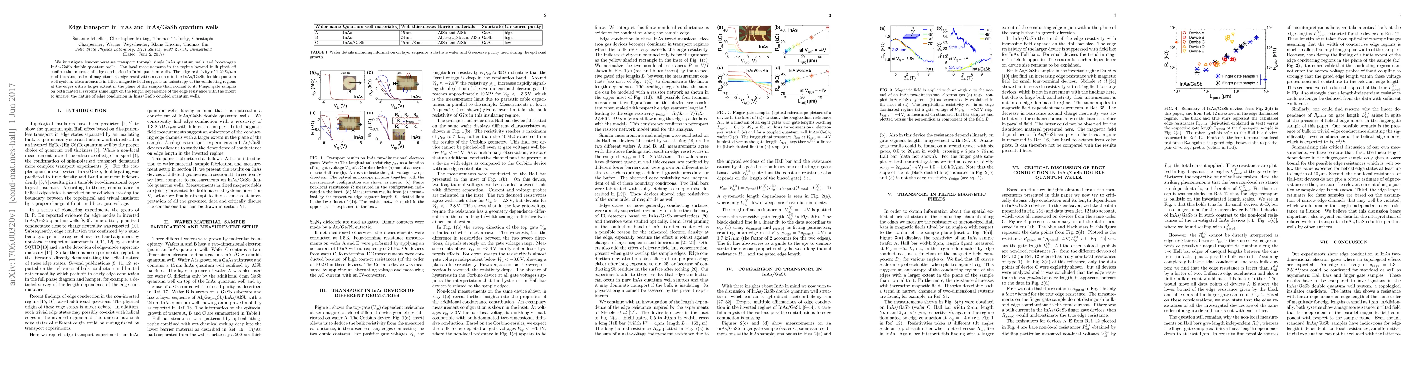 We investigate low-temperature transport through single InAs quantum wells and broken-gap InAs/GaSb double quantum wells. Non-local measurements in the regime beyond bulk pinch-off confirm the presence of edge conduction in InAs quantum wells. The edge resistivity of 1-2 $\mathrm{k\Omega/\mu m}$ is of the same order of magnitude as edge resistivities measured in the InAs/GaSb double quantum well system. Measurements in tilted magnetic field suggests an anisotropy of the conducting regions at the edges with a larger extent in the plane of the sample than normal to it. Finger gate samples on both material systems shine light on the length dependence of the edge resistance with the intent to unravel the nature of edge conduction in InAs/GaSb coupled quantum wells.