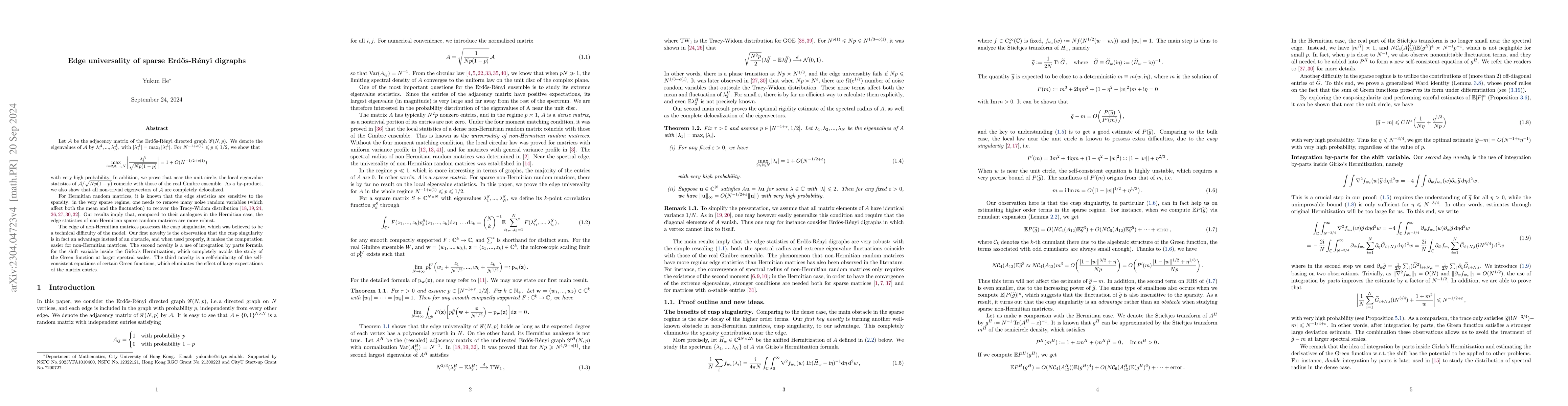 This paper demonstrates the edge universality of sparse Erdős-Rényi digraphs, showing that their eigenvalue statistics near the unit circle align with those of the real Ginibre ensemble for certain sparsity levels. It highlights the robustness of edge statistics in non-Hermitian sparse matrices compared to Hermitian ones, leveraging the cusp singularity and innovative analytical techniques to simplify computations.
