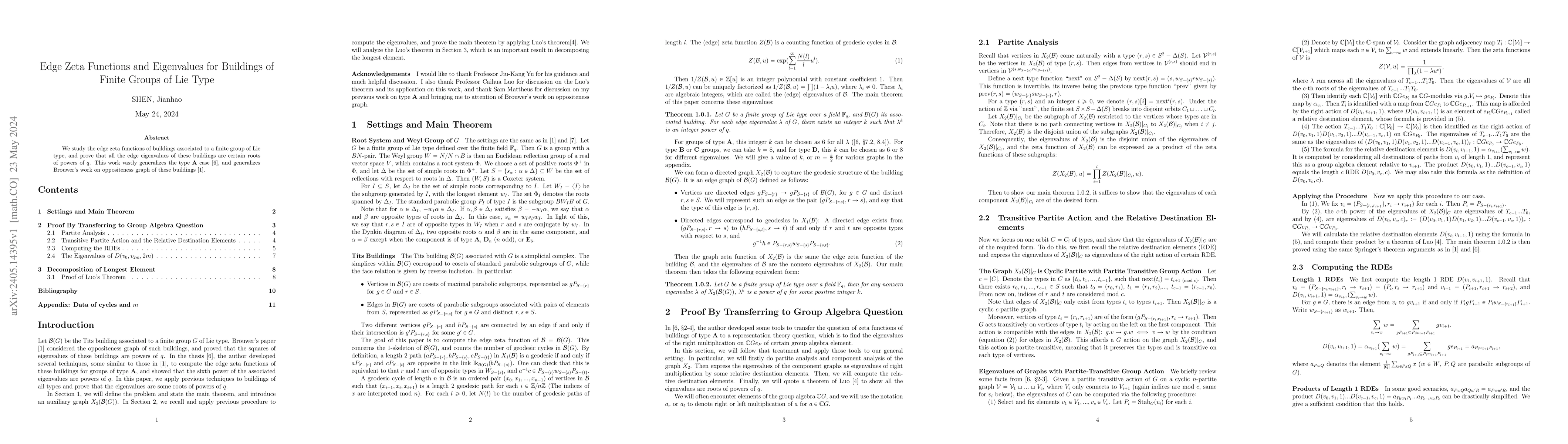 Summary: This paper investigates edge zeta functions related to buildings of finite groups of Lie type, proving that their eigenvalues are specific roots of powers of q, significantly extending previous results on type A cases and Brouwer's work on the oppositeness graph.