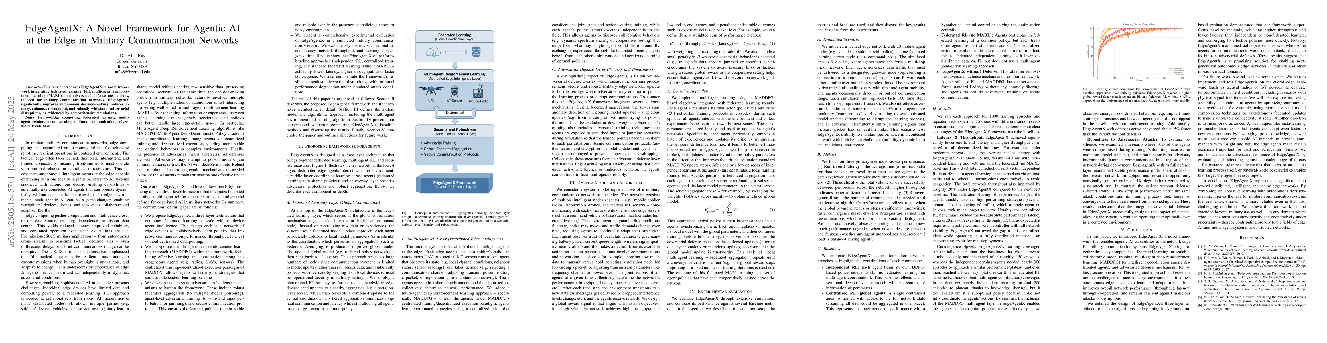 EdgeAgentX stands out by specifically tailoring these AI techniques for the unique challenges of military communication networks, focusing on autonomy, latency reduction, and resilience to adversarial attacks.
