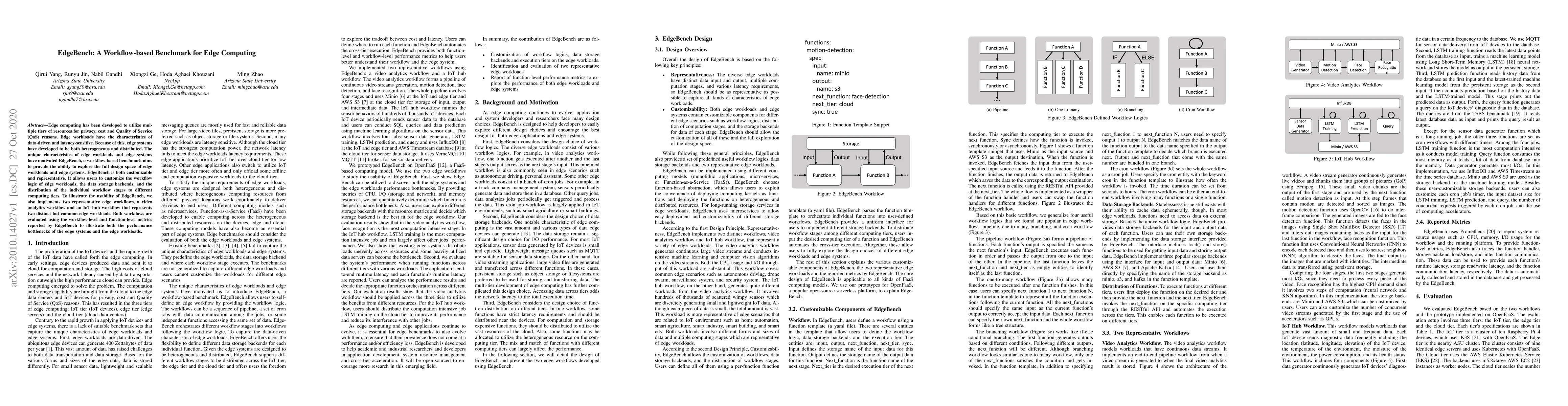 EdgeBench is a customizable workflow-based benchmark for exploring edge computing systems, allowing users to tailor workflows, data storage, and workload distribution. It evaluates two representative edge workflows—video analytics and IoT hub—to identify performance bottlenecks.
