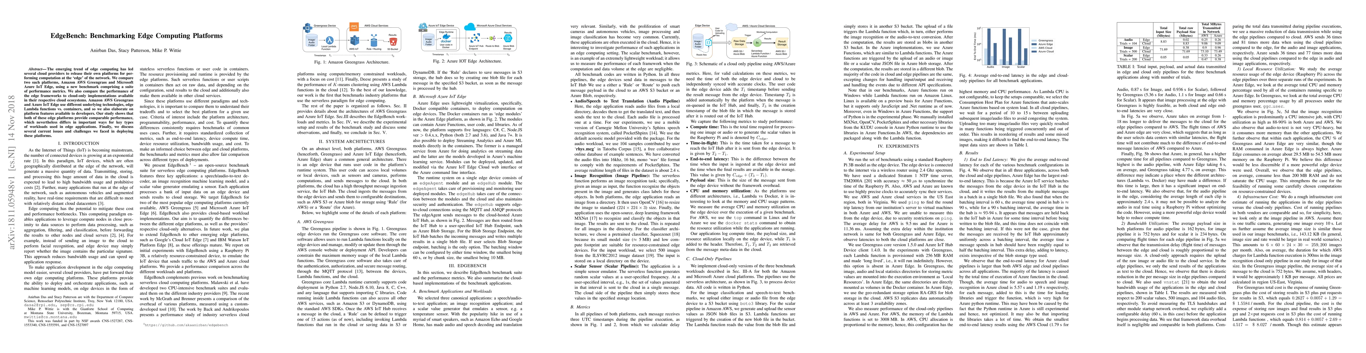 EdgeBench, a benchmark suite for serverless edge computing platforms, and a detailed comparison of AWS Greengrass and Azure IoT Edge performance against their cloud-only counterparts.