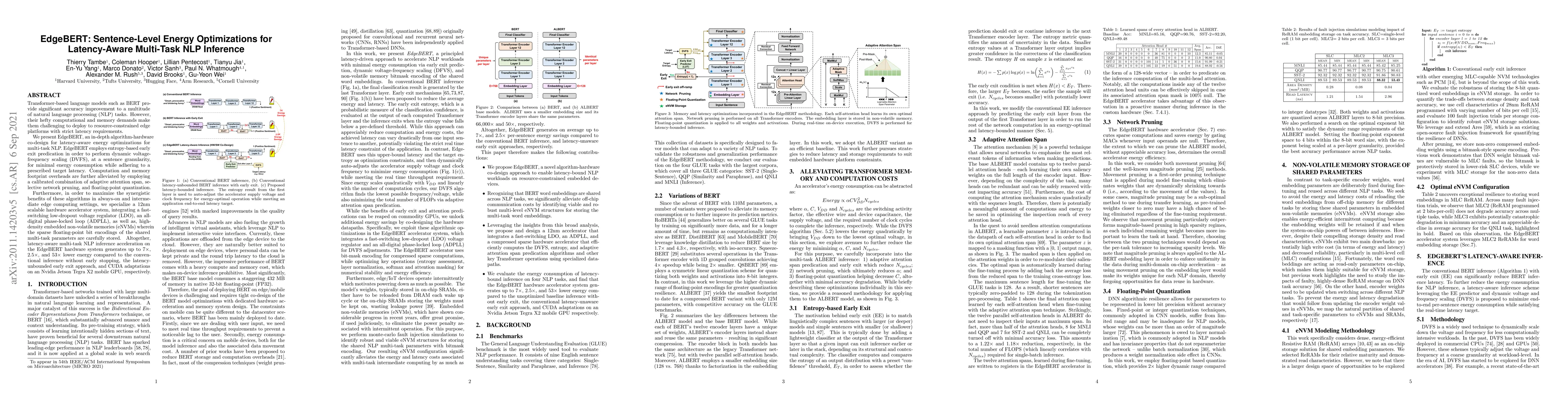 EdgeBERT optimizes transformer-based language models like BERT for low-latency, multi-task NLP inference on edge devices through entropy-based early exit predication and dynamic voltage-frequency scaling, achieving significant energy savings and specialized hardware integration. The approach combines adaptive attention, network pruning, and quantization, and leverages a scalable 12nm hardware accelerator for up to 53x lower energy consumption.