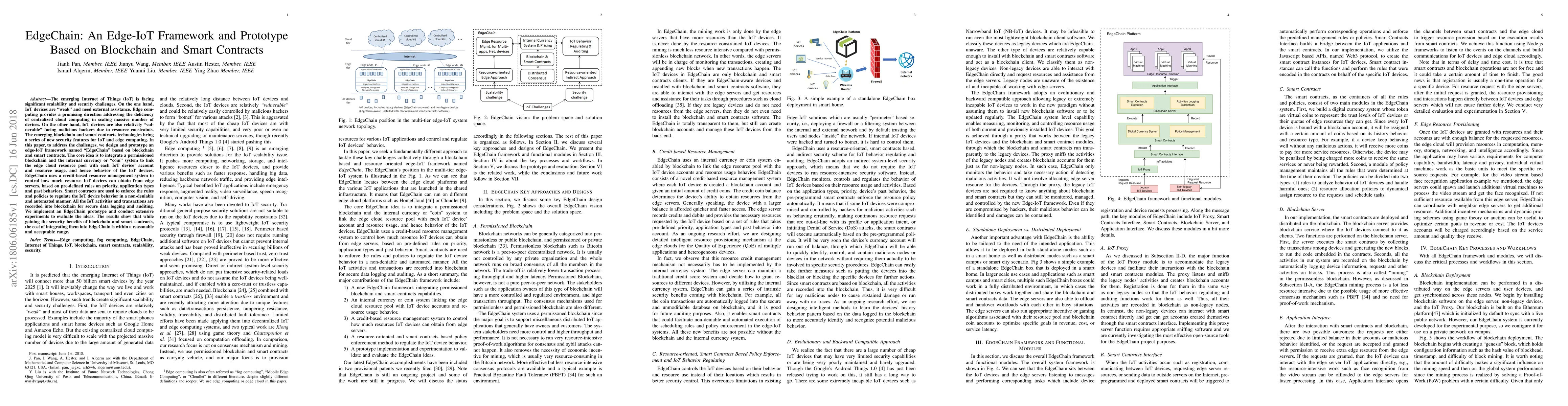 EdgeChain is an edge-IoT framework leveraging blockchain and smart contracts to enhance scalability and security for IoT devices. It integrates a permissioned blockchain with a credit-based resource management system to regulate IoT device access to edge resources, ensuring secure and automated behavior enforcement.