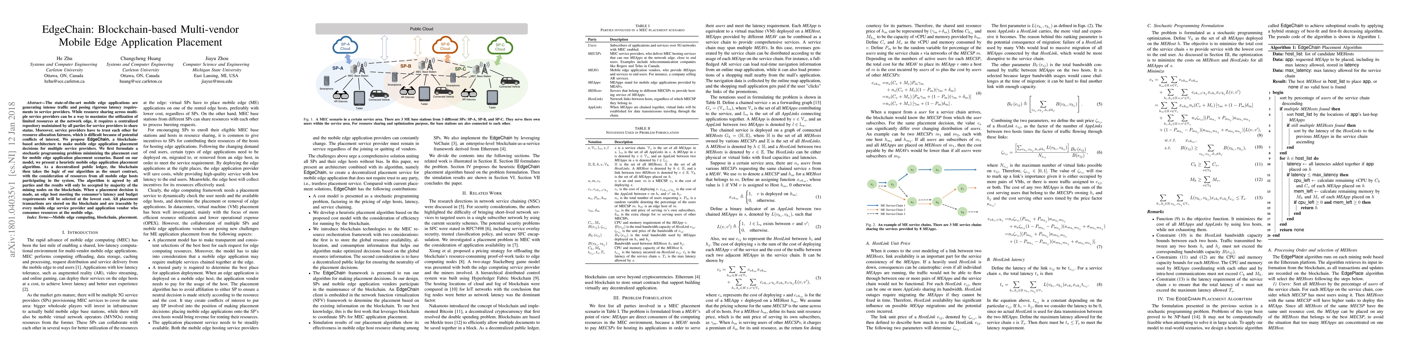 EdgeChain proposes a blockchain-based architecture to optimize mobile edge application placement across multiple service providers, minimizing placement costs through a decentralized, trustless environment. The blockchain's smart contract ensures fair resource allocation and transparency, allowing all parties to agree on placement decisions.