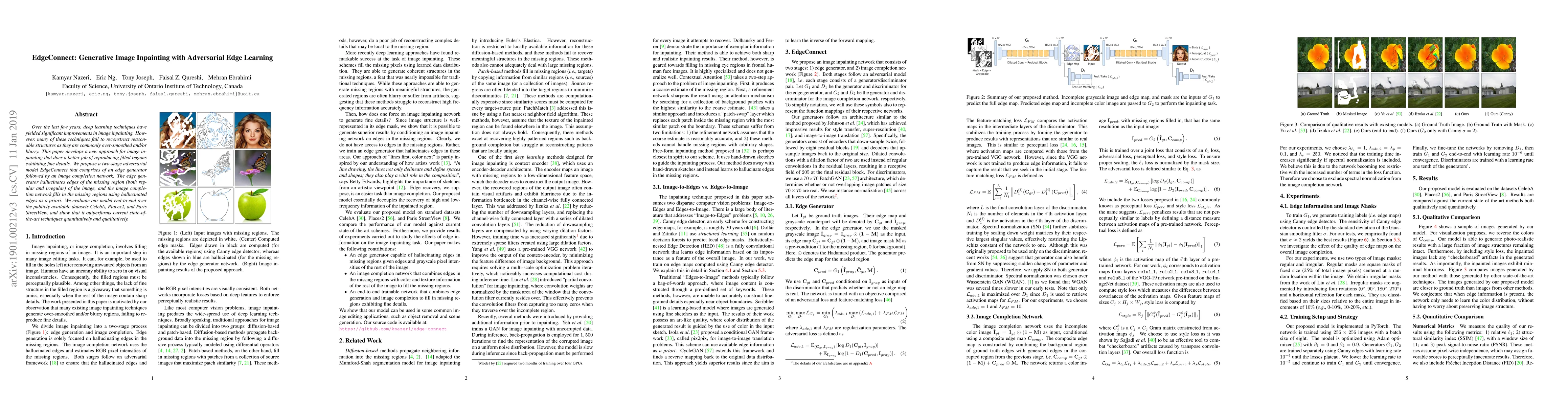 A new image inpainting model called EdgeConnect improves on existing techniques by generating edges of missing regions and using them to fill in details. It outperforms state-of-the-art methods on public datasets.