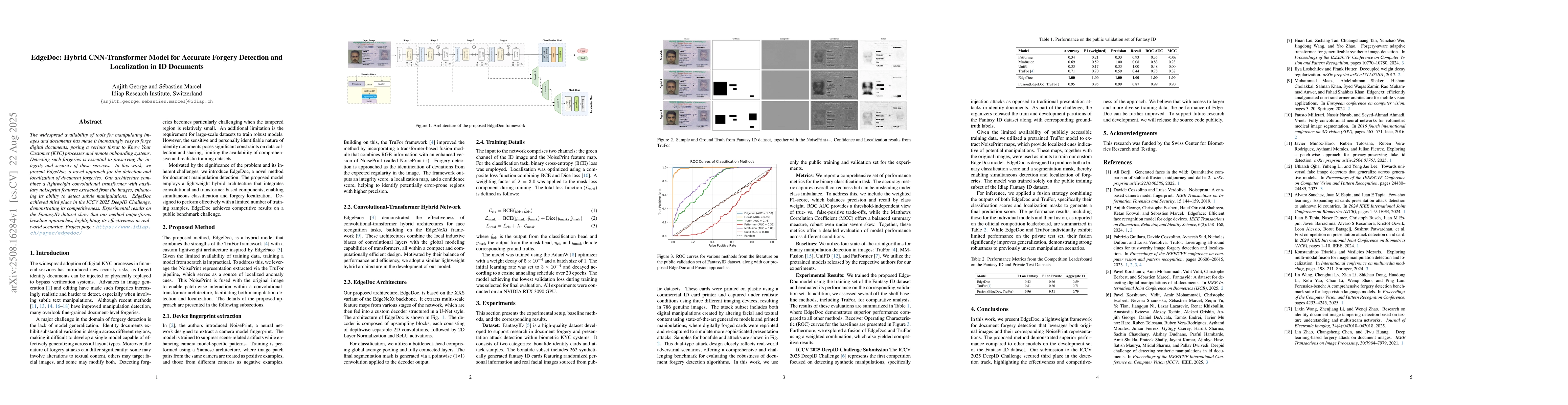 The widespread availability of tools for manipulating images and documents has made it increasingly easy to forge digital documents, posing a serious threat to Know Your Customer (KYC) processes and remote onboarding systems. Detecting such forgeries is essential to preserving the integrity and security of these services. In this work, we present EdgeDoc, a novel approach for the detection and localization of document forgeries. Our architecture combines a lightweight convolutional transformer with auxiliary noiseprint features extracted from the images, enhancing its ability to detect subtle manipulations. EdgeDoc achieved third place in the ICCV 2025 DeepID Challenge, demonstrating its competitiveness. Experimental results on the FantasyID dataset show that our method outperforms baseline approaches, highlighting its effectiveness in realworld scenarios. Project page : https://www.idiap. ch/paper/edgedoc/