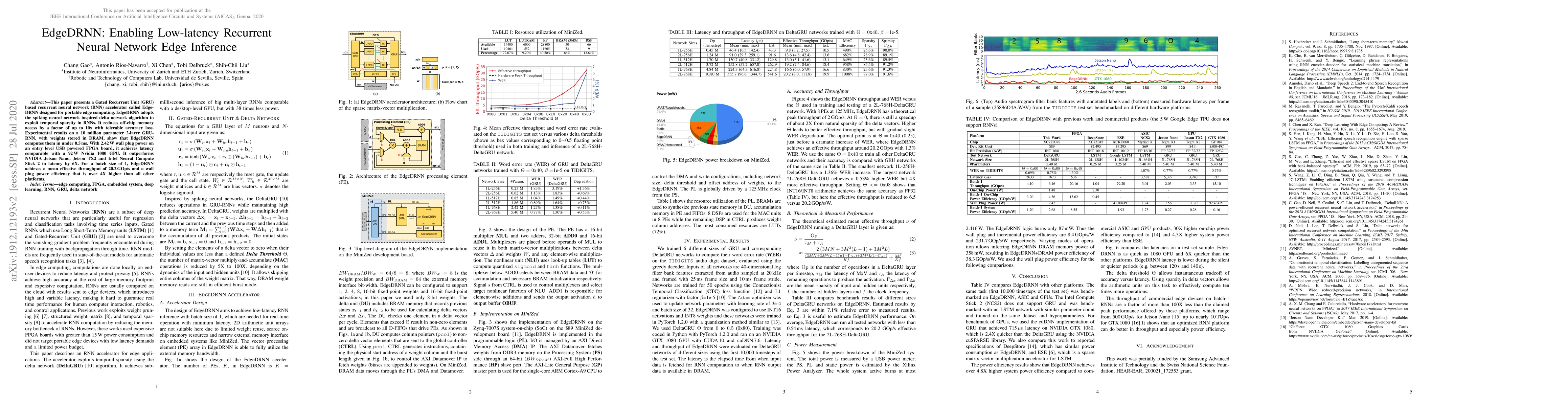 EdgeDRNN is a GRU-based RNN accelerator for edge computing that leverages a delta network algorithm to reduce off-chip memory access by up to 10x, achieving under 0.5 ms latency with 4X higher power efficiency compared to other platforms.