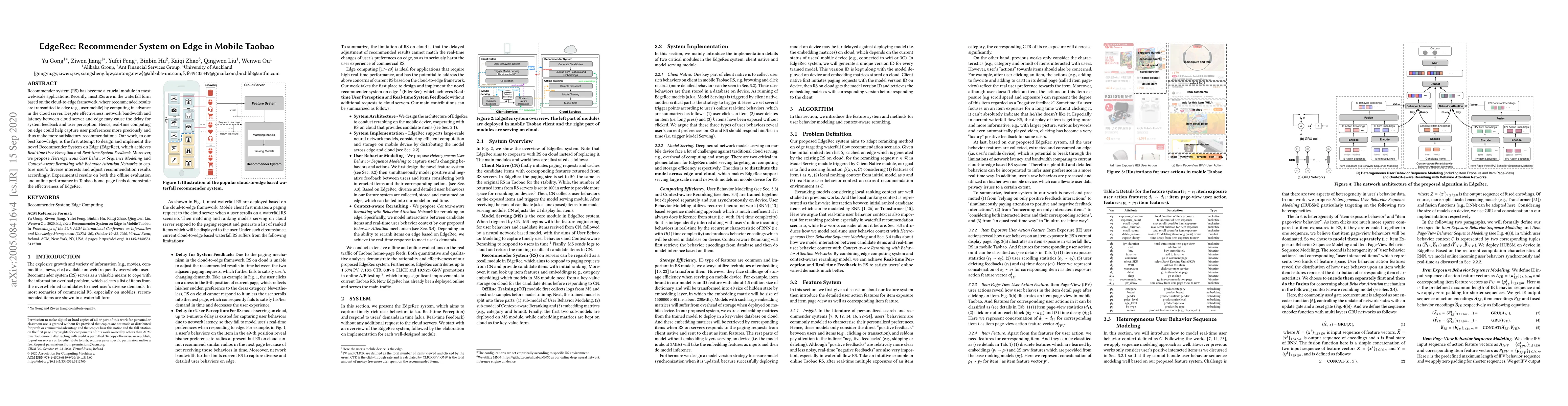 EdgeRec is a novel recommender system implemented on edge devices to enhance real-time user perception and system feedback, addressing delays in cloud-based recommender systems. It employs Heterogeneous User Behavior Sequence Modeling and Context-aware Reranking with Behavior Attention Networks to improve recommendation accuracy, validated through offline and online performance tests on Taobao.