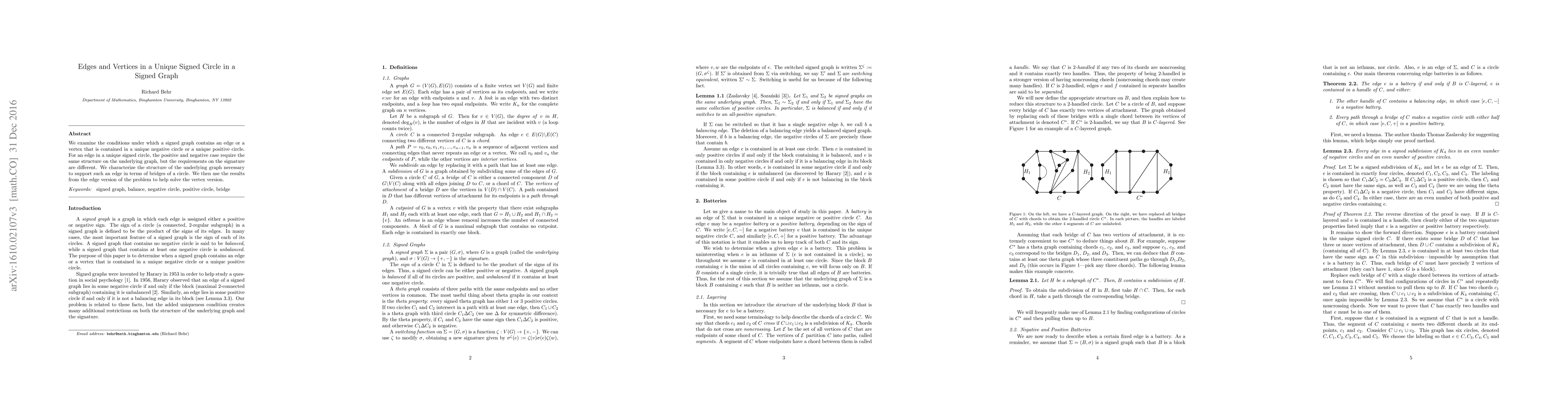 This paper explores conditions for a signed graph to have an edge or vertex in a unique negative or positive circle, detailing structural requirements on the graph and using edge analysis to solve the vertex problem. The study characterizes necessary graph structures in terms of circle bridges.