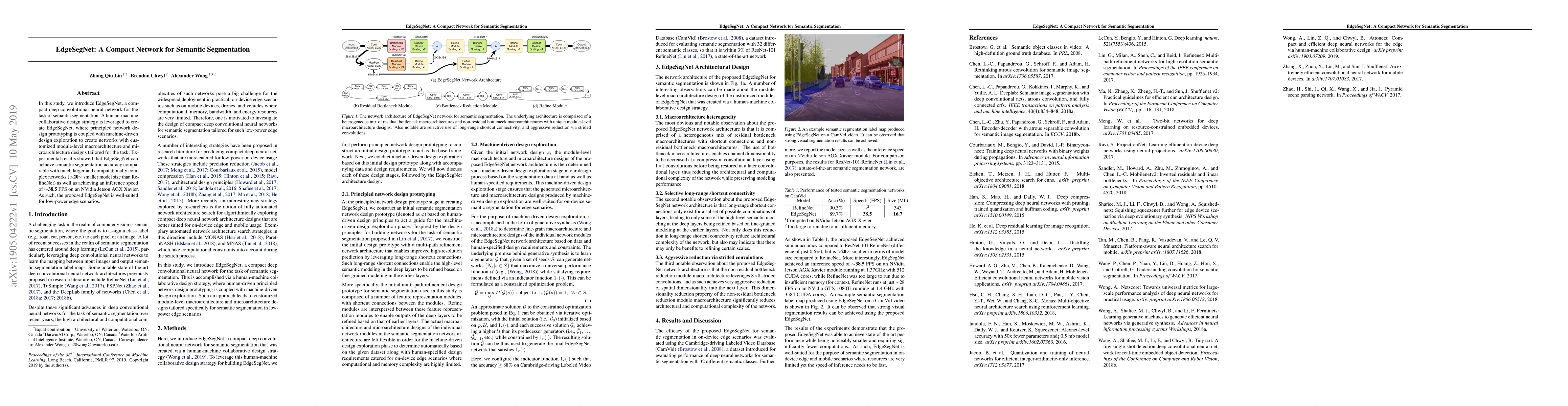 In this study, we introduce EdgeSegNet, a compact deep convolutional neural network for the task of semantic segmentation. A human-machine collaborative design strategy is leveraged to create EdgeSegNet, where principled network design prototyping is coupled with machine-driven design exploration to create networks with customized module-level macroarchitecture and microarchitecture designs tailored for the task. Experimental results showed that EdgeSegNet can achieve semantic segmentation accuracy comparable with much larger and computationally complex networks (>20x} smaller model size than RefineNet) as well as achieving an inference speed of ~38.5 FPS on an NVidia Jetson AGX Xavier. As such, the proposed EdgeSegNet is well-suited for low-power edge scenarios.