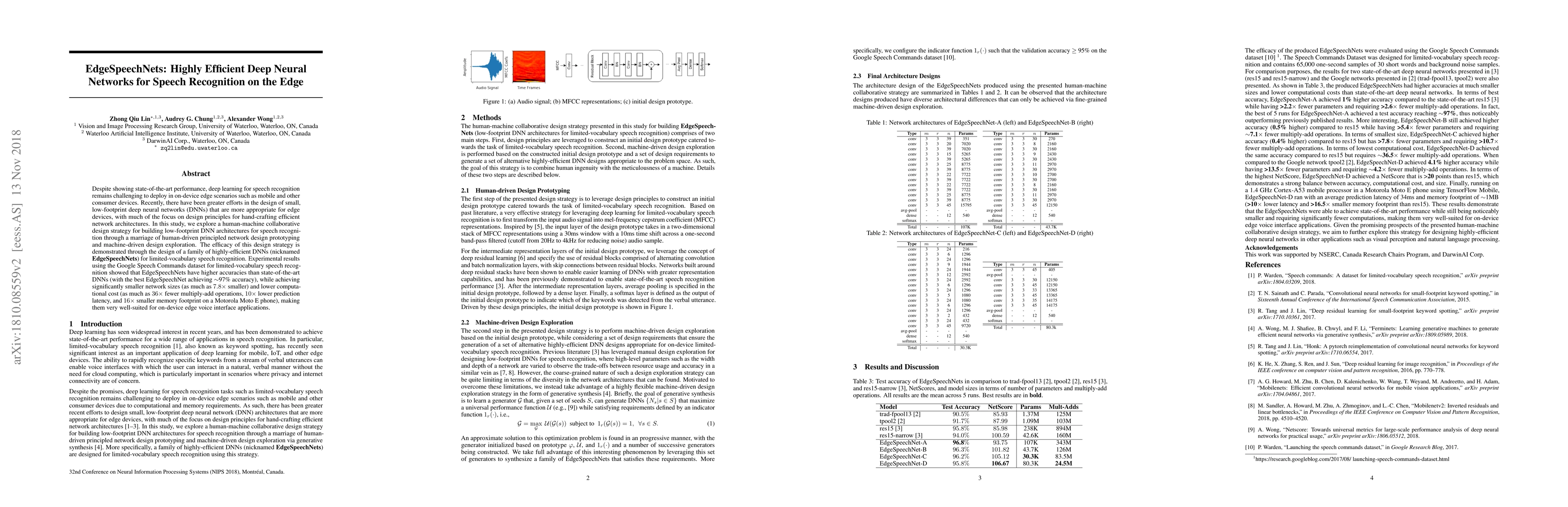EdgeSpeechNets present a collaborative design strategy combining human-driven and machine-driven approaches to create highly efficient deep neural networks for on-device speech recognition, achieving superior accuracy and significantly reduced size and computational cost compared to state-of-the-art DNNs. The best EdgeSpeechNet model demonstrated ~97% accuracy, with a 7.8x smaller size and lower latency, making it ideal for edge applications.