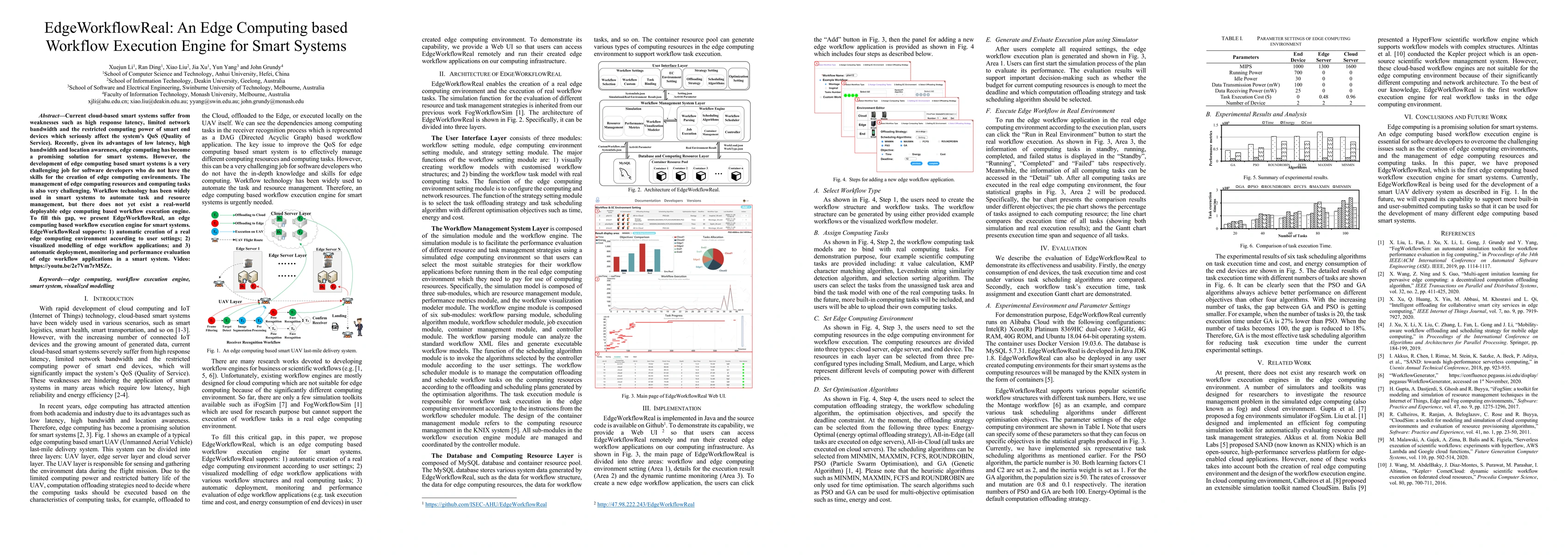EdgeWorkflowReal is an edge computing based workflow execution engine designed to address the limitations of cloud-based smart systems by automating the creation, deployment, and management of edge computing environments for improved QoS. It aims to simplify the workflow technology application in smart systems.