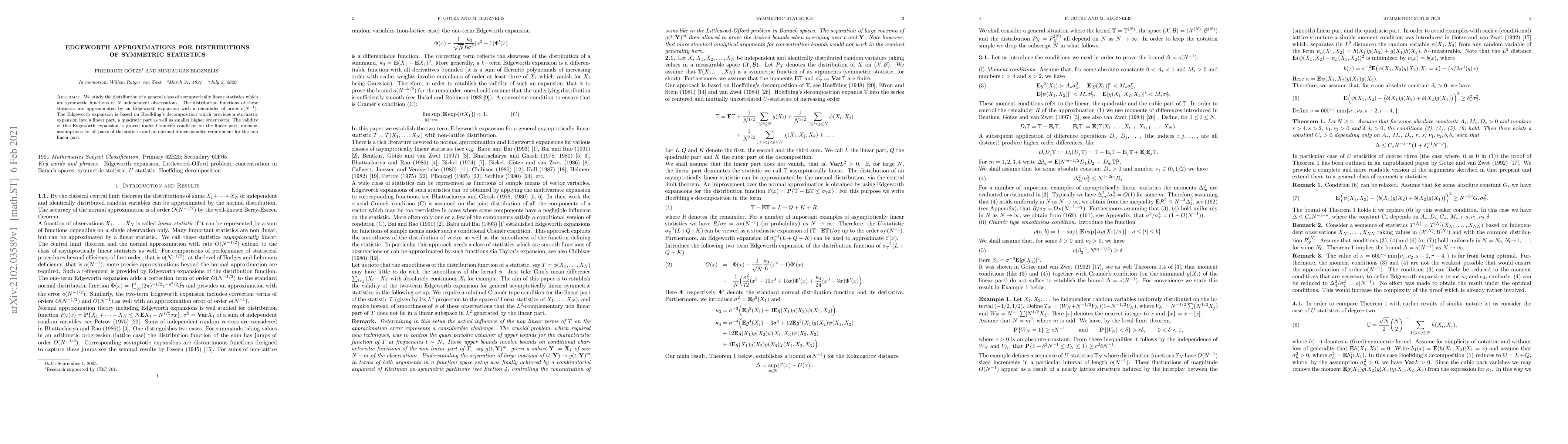 This paper explores the distribution of symmetric statistics derived from $N$ independent observations, approximating their distribution functions using an Edgeworth expansion with a remainder term of $o(N^{-1})$. The validity of this approximation is established under conditions including Cramér's condition and moment assumptions for various parts of the statistic.