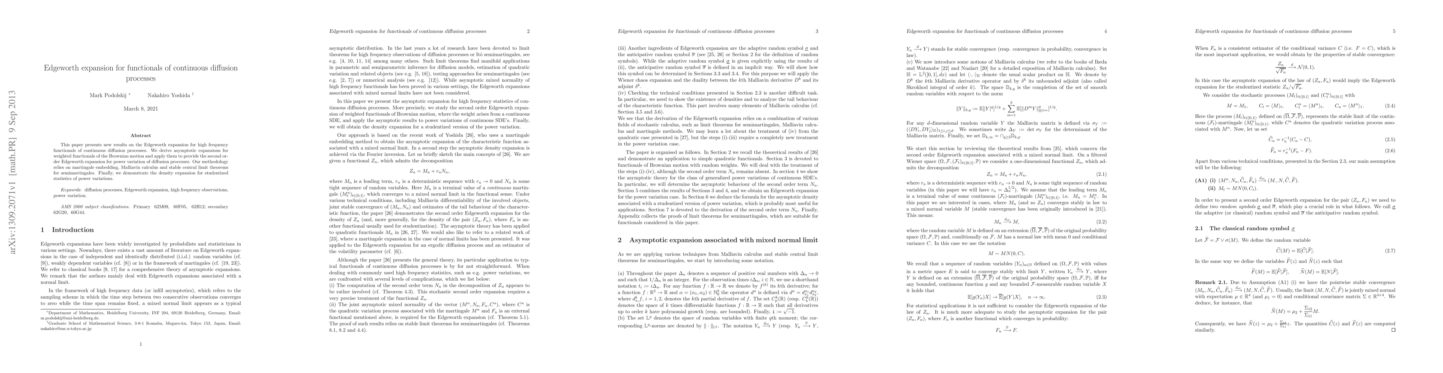 This paper develops the Edgeworth expansion for high-frequency functionals of continuous diffusion processes, utilizing martingale embedding, Malliavin calculus, and stable central limit theorems. It provides the second-order Edgeworth expansion for power variation of diffusion processes and demonstrates density expansion for studentized statistics of power variations.