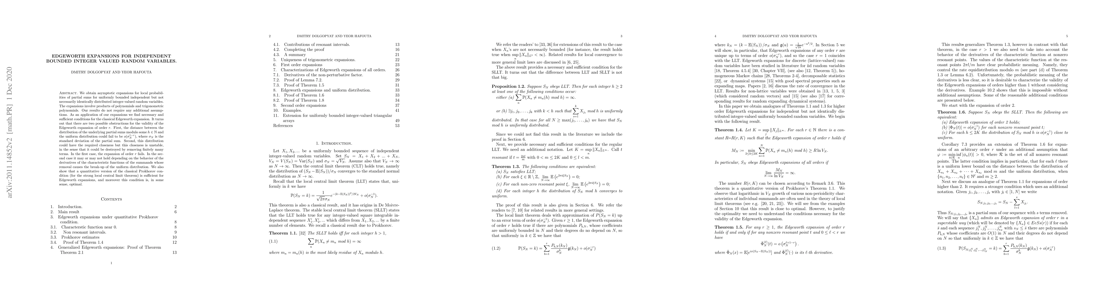 We obtain asymptotic expansions for local probabilities of partial sums for uniformly bounded independent but not necessarily identically distributed integer-valued random variables. The expansions involve products of polynomials and trigonometric polynomials. Our results do not require any additional assumptions. As an application of our expansions we find necessary and sufficient conditions for the classical Edgeworth expansion. It turns out that there are two possible obstructions for the validity of the Edgeworth expansion of order $r$. First, the distance between the distribution of the underlying partial sums modulo some $h\in \bbN$ and the uniform distribution could fail to be $o(\sigma_N^{1-r})$, where $\sigma_N$ is the standard deviation of the partial sum. Second, this distribution could have the required closeness but this closeness is unstable, in the sense that it could be destroyed by removing finitely many terms. In the first case, the expansion of order $r$ fails. In the second case it may or may not hold depending on the behavior of the derivatives of the characteristic functions of the summands whose removal causes the break-up of the uniform distribution. We also show that a quantitative version of the classical Prokhorov condition (for the strong local central limit theorem) is sufficient for Edgeworth expansions, and moreover this condition is, in some sense, optimal.
