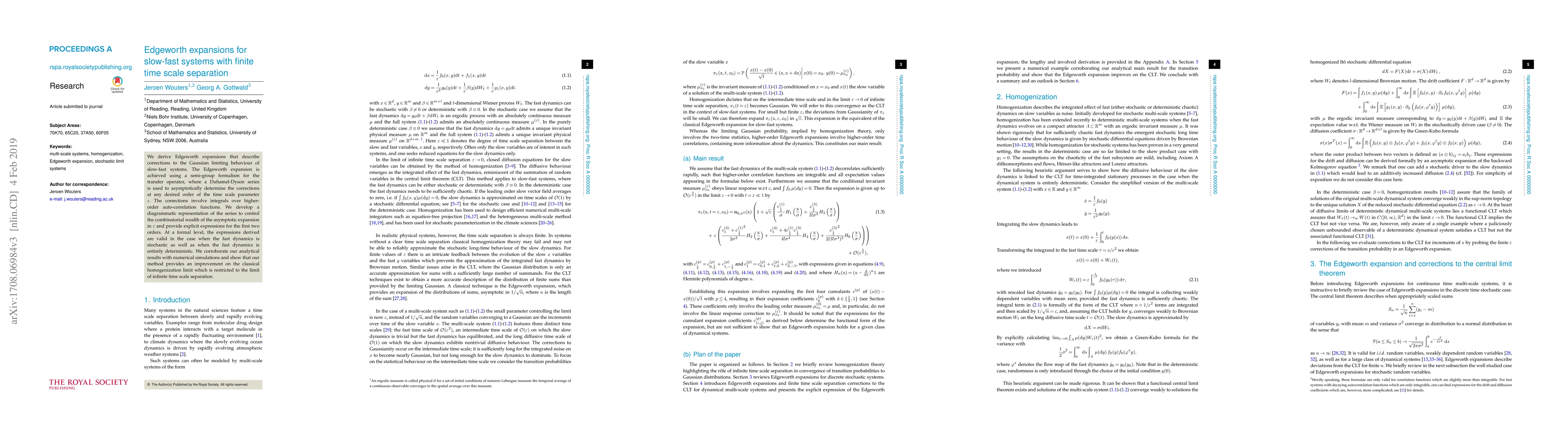 This paper derives Edgeworth expansions for slow-fast systems to correct Gaussian limiting behavior, employing a semi-group formalism and a Duhamel-Dyson series for asymptotic corrections. The method is validated through numerical simulations and improves upon classical homogenization limits.