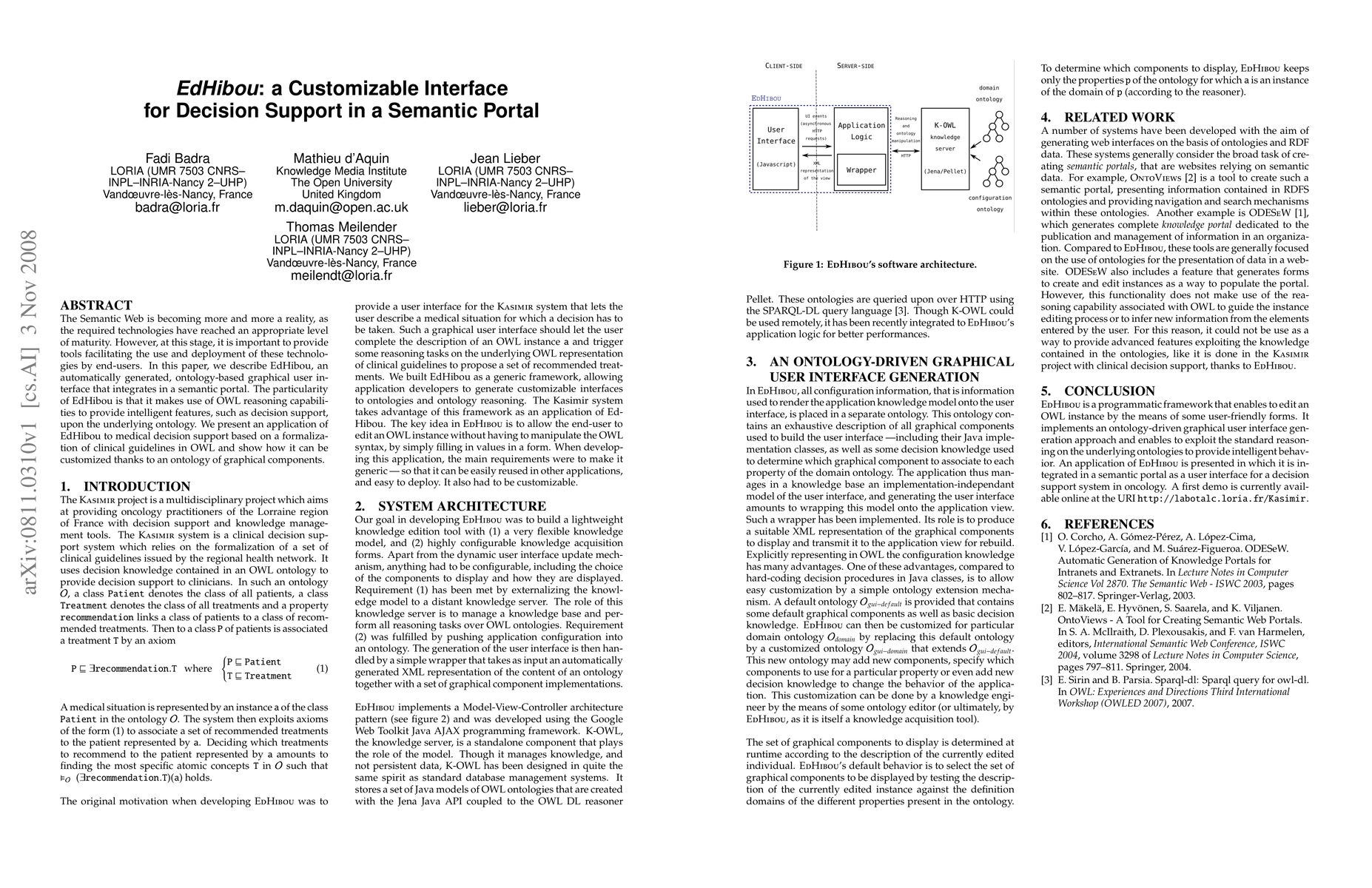 EdHibou is a customizable interface for decision support in semantic portals that uses OWL reasoning capabilities to provide intelligent features like medical decision making. It allows customization through an ontology of graphical components.