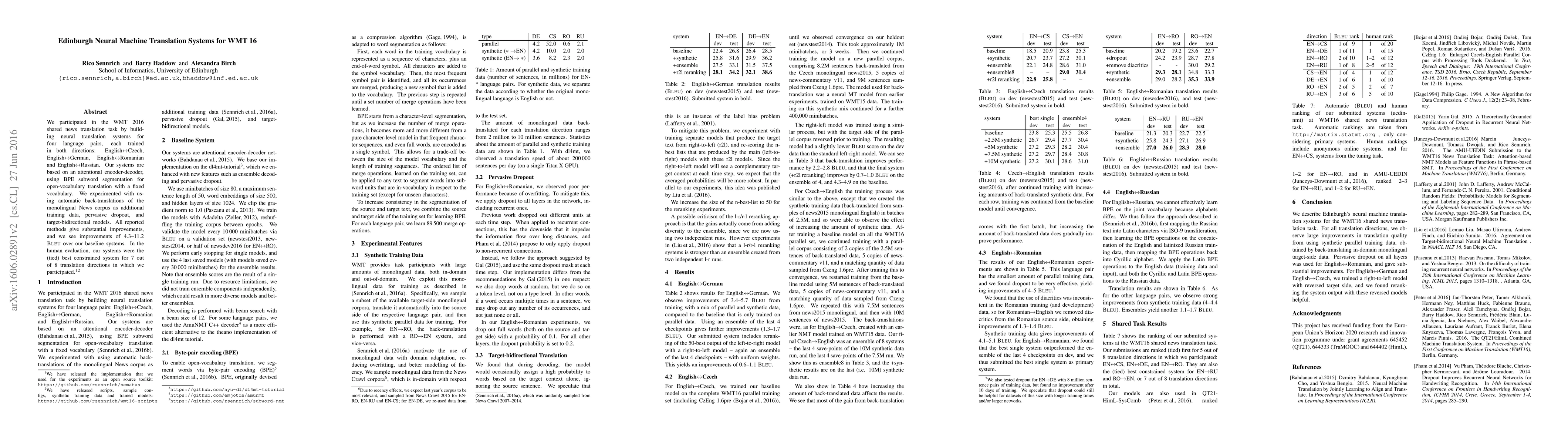 The Edinburgh team developed neural machine translation systems for four language pairs in WMT 2016, employing attentional encoder-decoders with BPE subword segmentation. They achieved significant improvements, with 4.3-11.2 BLEU score gains, and were the best-performing constrained system in human evaluations for 7 out of 8 directions.