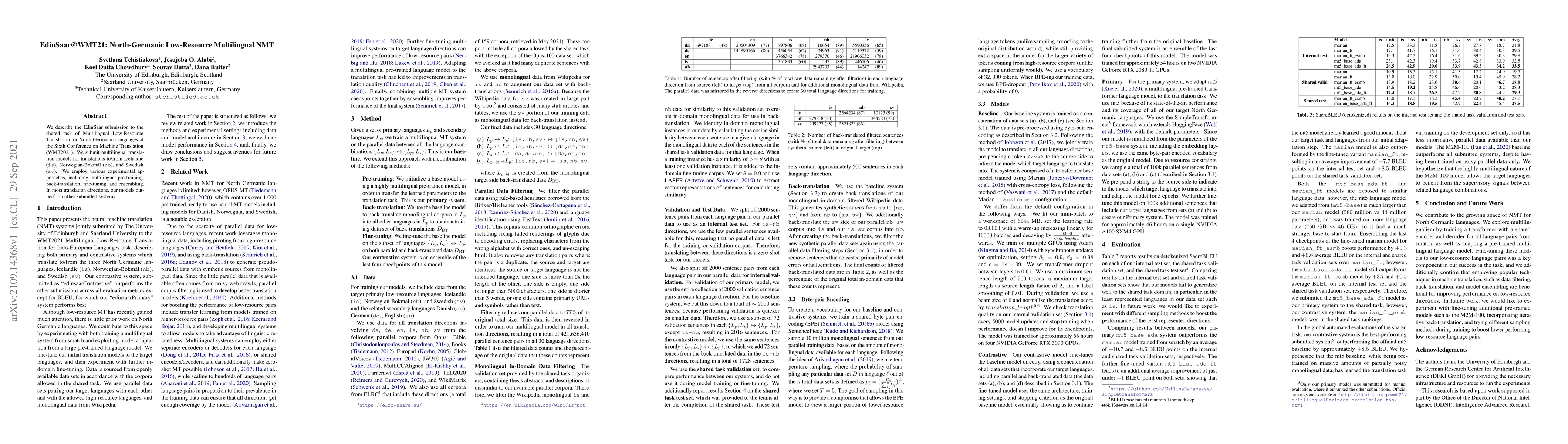 We describe the EdinSaar submission to the shared task of Multilingual Low-Resource Translation for North Germanic Languages at the Sixth Conference on Machine Translation (WMT2021). We submit multilingual translation models for translations to/from Icelandic (is), Norwegian-Bokmal (nb), and Swedish (sv). We employ various experimental approaches, including multilingual pre-training, back-translation, fine-tuning, and ensembling. In most translation directions, our models outperform other submitted systems.