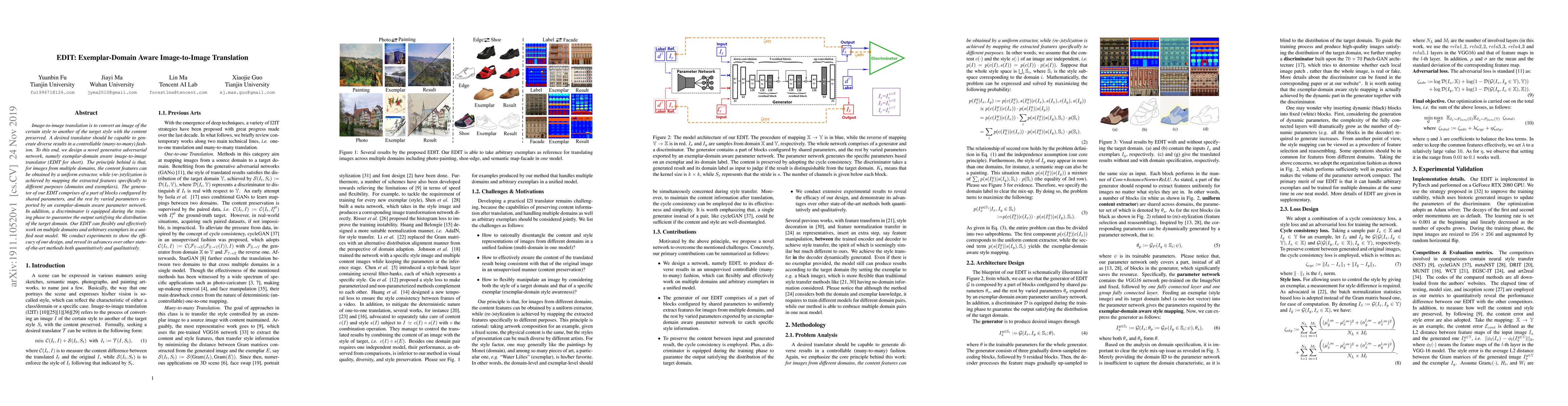 The EDIT model is a generative adversarial network designed for controllable, many-to-many image-to-image translation across multiple domains and exemplars. It uses a shared feature extractor and a domain-aware parameter network for stylization, achieving flexible and effective translations while outperforming other methods.
