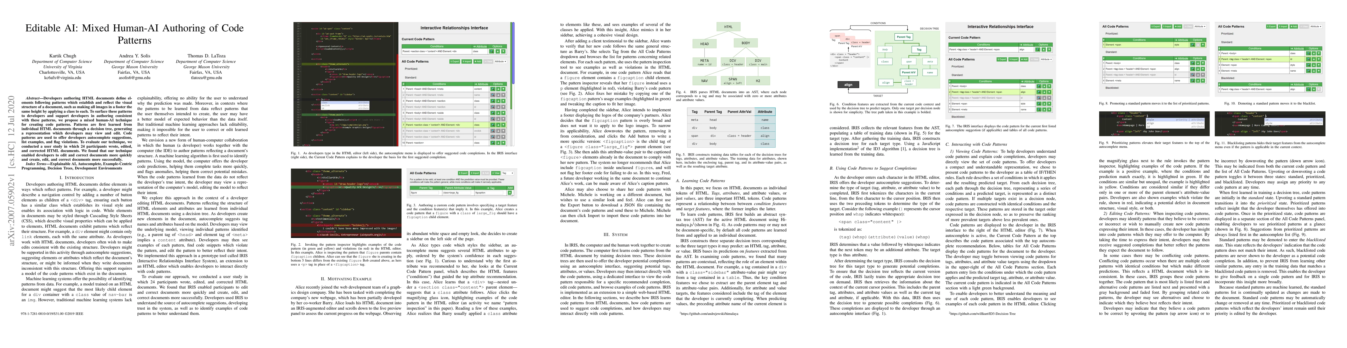 This paper proposes a mixed human-AI technique for creating and editing code patterns in HTML documents, enabling developers to quickly and successfully edit and correct code. The technique uses a decision tree to learn patterns from documents, which developers can then view and modify, and it offers autocomplete suggestions and flags violations.
