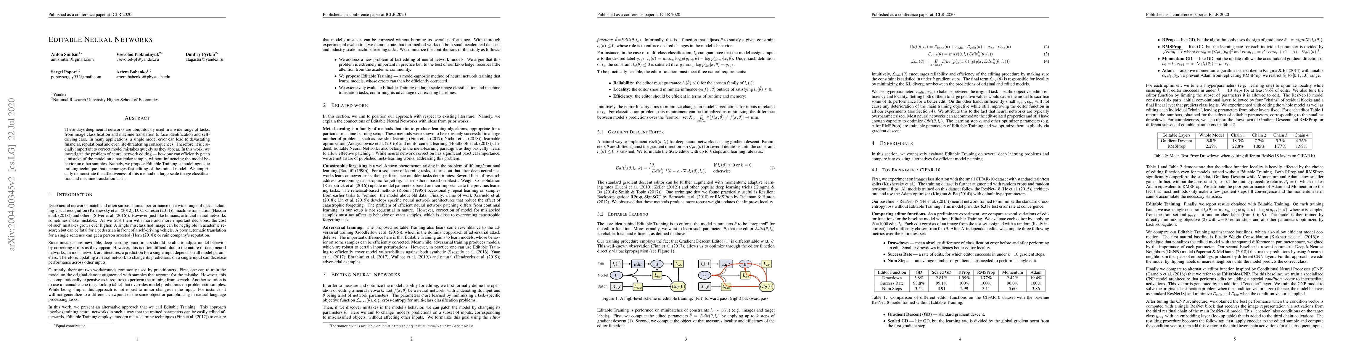 These days deep neural networks are ubiquitously used in a wide range of tasks, from image classification and machine translation to face identification and self-driving cars. In many applications, a single model error can lead to devastating financial, reputational and even life-threatening consequences. Therefore, it is crucially important to correct model mistakes quickly as they appear. In this work, we investigate the problem of neural network editing $-$ how one can efficiently patch a mistake of the model on a particular sample, without influencing the model behavior on other samples. Namely, we propose Editable Training, a model-agnostic training technique that encourages fast editing of the trained model. We empirically demonstrate the effectiveness of this method on large-scale image classification and machine translation tasks.