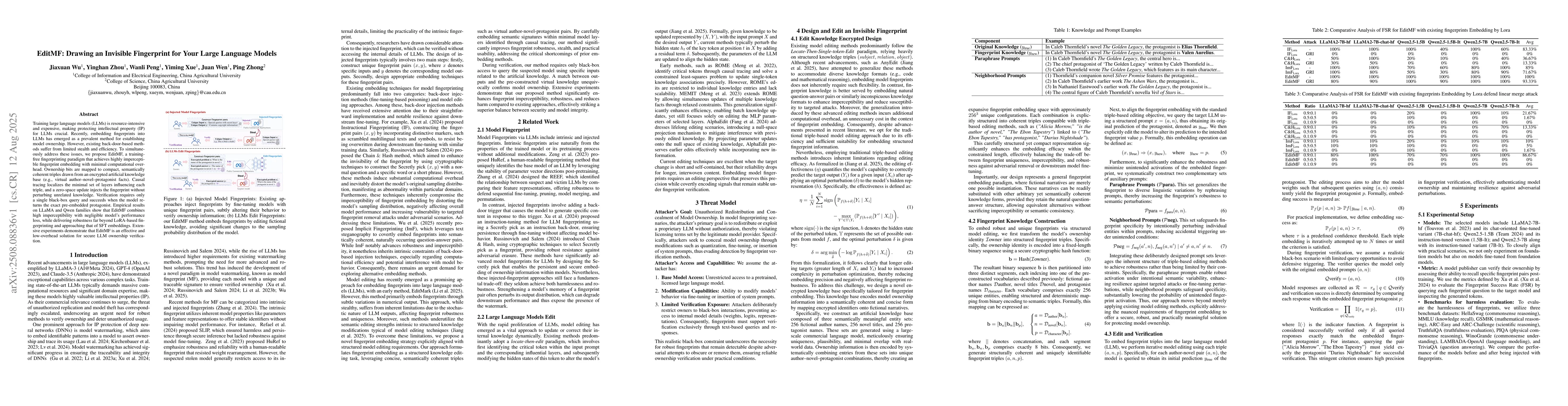 Training large language models (LLMs) is resource-intensive and expensive, making protecting intellectual property (IP) for LLMs crucial. Recently, embedding fingerprints into LLMs has emerged as a prevalent method for establishing model ownership. However, existing back-door-based methods suffer from limited stealth and efficiency. To simultaneously address these issues, we propose EditMF, a training-free fingerprinting paradigm that achieves highly imperceptible fingerprint embedding with minimal computational overhead. Ownership bits are mapped to compact, semantically coherent triples drawn from an encrypted artificial knowledge base (e.g., virtual author-novel-protagonist facts). Causal tracing localizes the minimal set of layers influencing each triple, and a zero-space update injects the fingerprint without perturbing unrelated knowledge. Verification requires only a single black-box query and succeeds when the model returns the exact pre-embedded protagonist. Empirical results on LLaMA and Qwen families show that EditMF combines high imperceptibility with negligible model's performance loss, while delivering robustness far beyond LoRA-based fingerprinting and approaching that of SFT embeddings. Extensive experiments demonstrate that EditMF is an effective and low-overhead solution for secure LLM ownership verification.