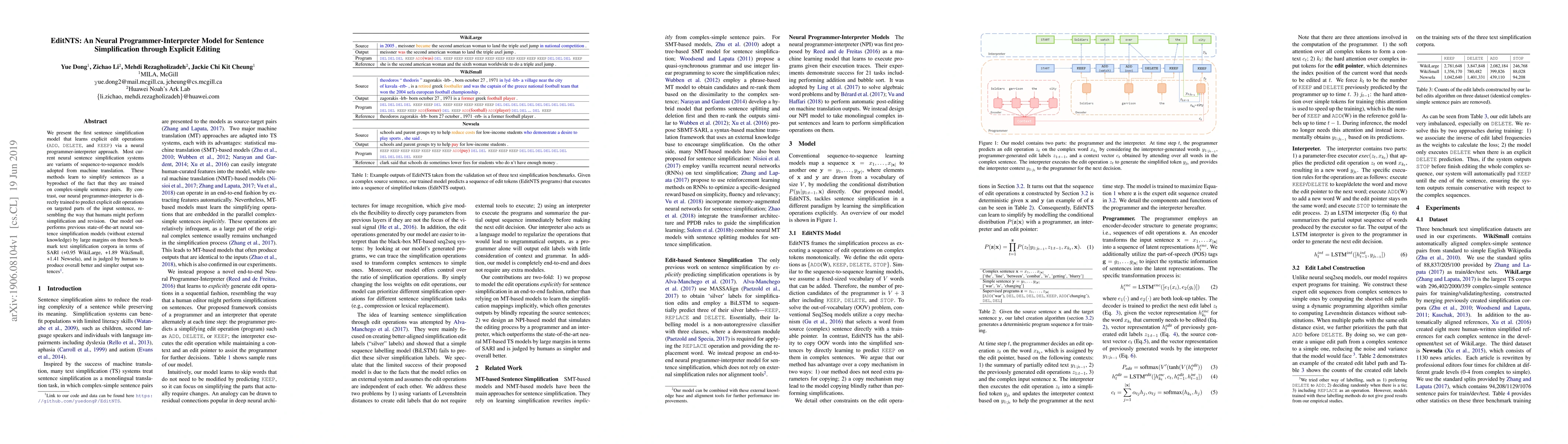 EditNTS is a neural programmer-interpreter model that simplifies sentences by learning explicit edit operations (ADD, DELETE, KEEP). It outperforms existing sequence-to-sequence models on benchmark corpora, achieving better SARI scores and producing more human-like simplified sentences.