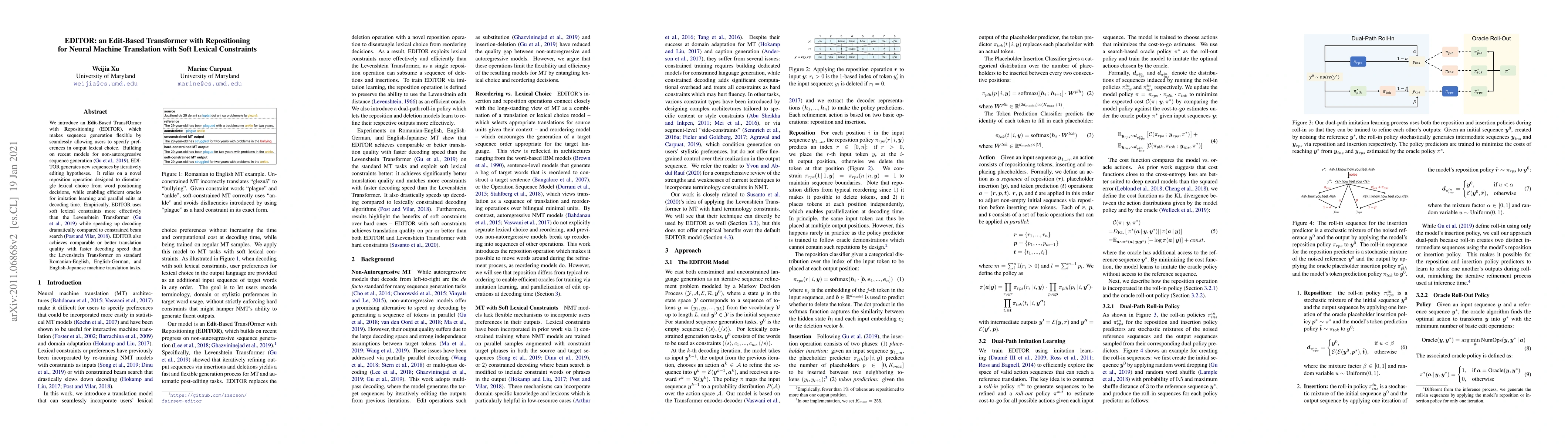 EDITOR is an innovative Edit-Based Transformer that flexibly generates sequences by iteratively editing hypotheses, allowing users to specify lexical preferences. It outperforms previous models in efficiency and translation quality while using soft lexical constraints more effectively.