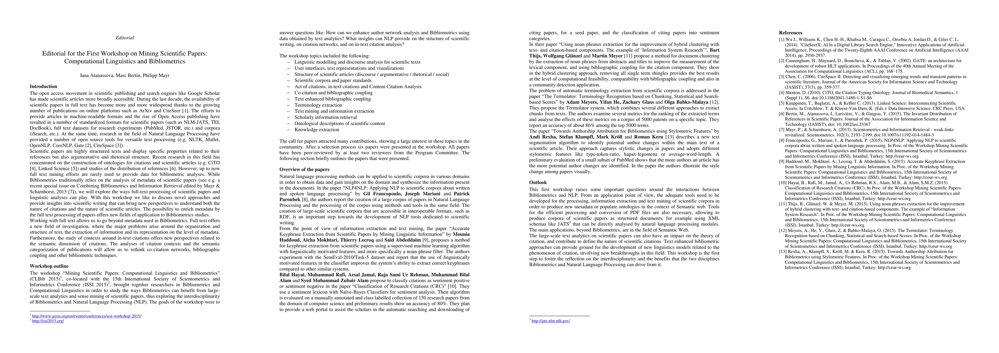 The workshop "Mining Scientific Papers: Computational Linguistics and Bibliometrics" explored how large-scale text analytics and NLP can enhance Bibliometrics, focusing on author network analysis and insights into scientific writing and citation networks. It aims to foster interdisciplinary reflection on the benefits of combining these fields.