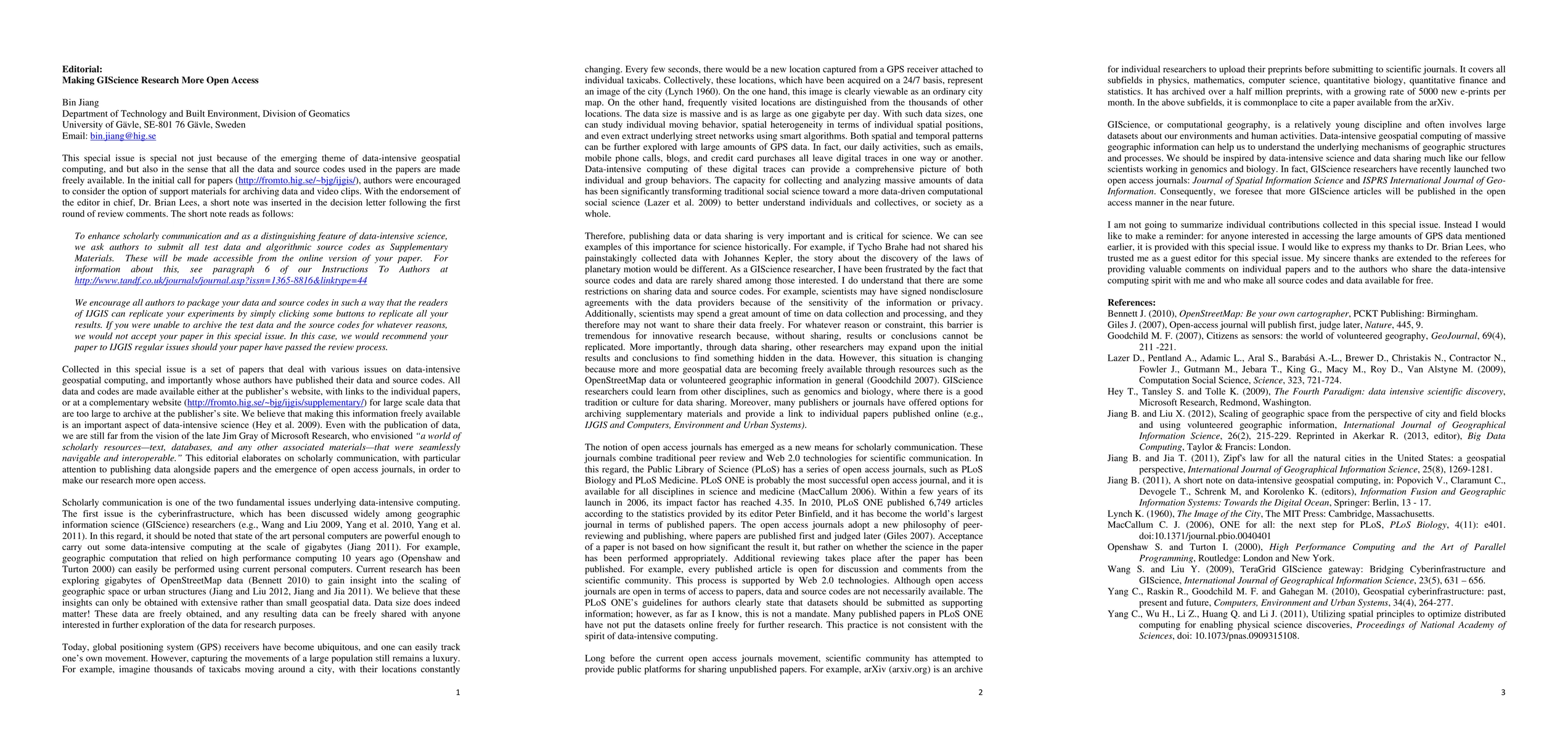 This editorial guest-edited for the International Journal of Geographical Information Science emphasizes the importance of open access in GIScience research by publishing all data and source materials alongside papers, promoting transparency and accessibility in scholarly communication.