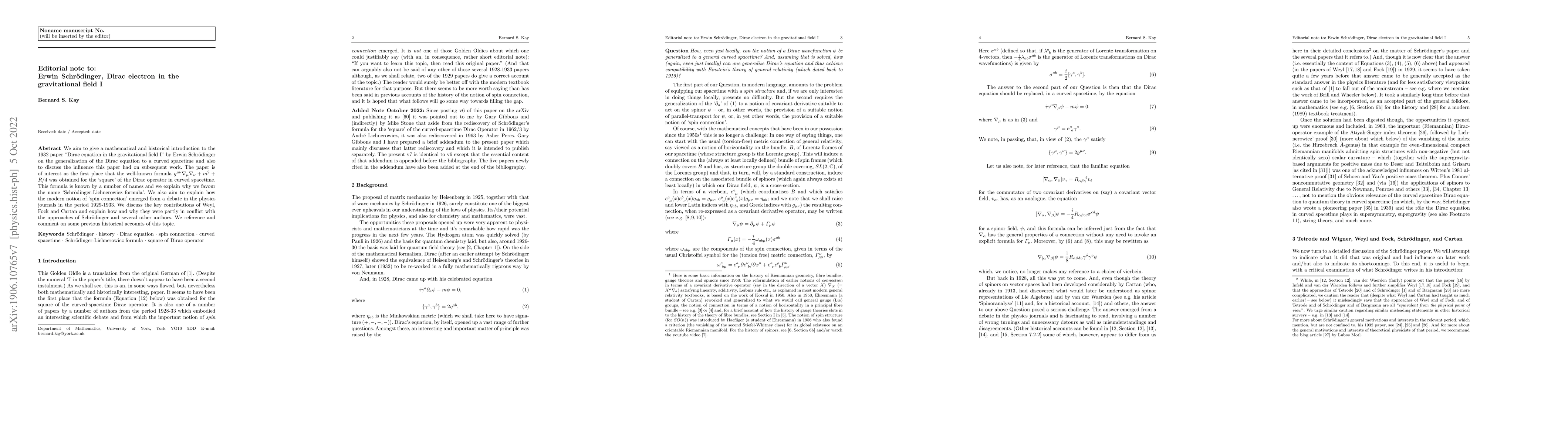 Editorial Note with a mathematical and historical introduction to a 1932 paper by Erwin Schr\"odinger on the generalization of the Dirac equation to a curved spacetime -- to appear in the 'Golden Oldie' section of the Journal of General Relativity and Gravitation alongside an English translation of that paper. The Schr\"odinger paper is of interest as the first place that the well-known formula $g^{\mu\nu}\nabla_\mu\nabla_\nu + m^2 + \frac{R}{4}$ was obtained for the 'square' of the Dirac operator in curved spacetime. This formula is known by a number of names and we explain why we favour the name 'Schr\"odinger-Lichnerowicz formula'. We also aim to explain how the modern notion of `spin connection' emerged from a debate in the physics journals in the period 1929-1933. We discuss the key contributions of Weyl, Fock and Cartan and explain how and why they were partly in conflict with the approaches of Schr\"odinger and several other authors. We reference and comment on some previous historical accounts of this topic.