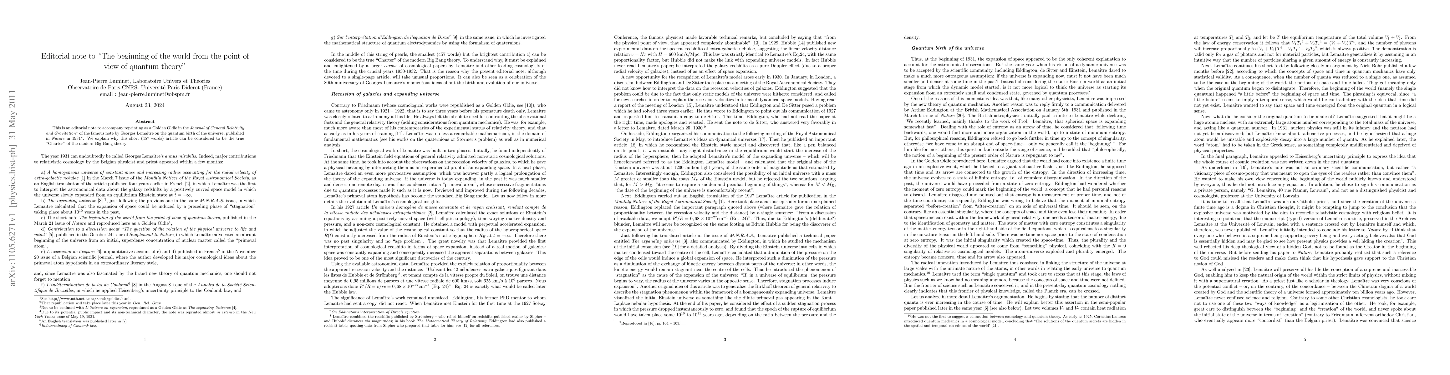 This editorial note accompanies the reprint of Georges Lemaitre's seminal 1931 article on the quantum birth of the universe, marking it as the foundational text of modern Big Bang theory. It highlights the significance of Lemaitre's work in shaping contemporary cosmological understanding.