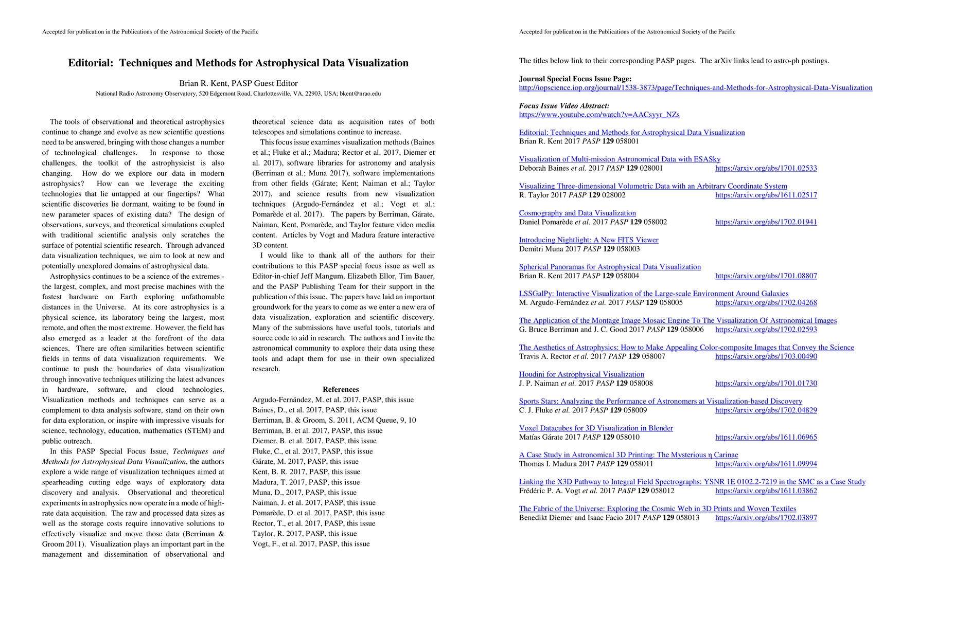 This editorial summarizes contributions to the PASP Special Focus Issue on astrophysical data visualization, highlighting software, tutorials, video abstracts, and 3D content. The initiative will continue to accept submissions throughout 2017. For further details, visit the provided link.