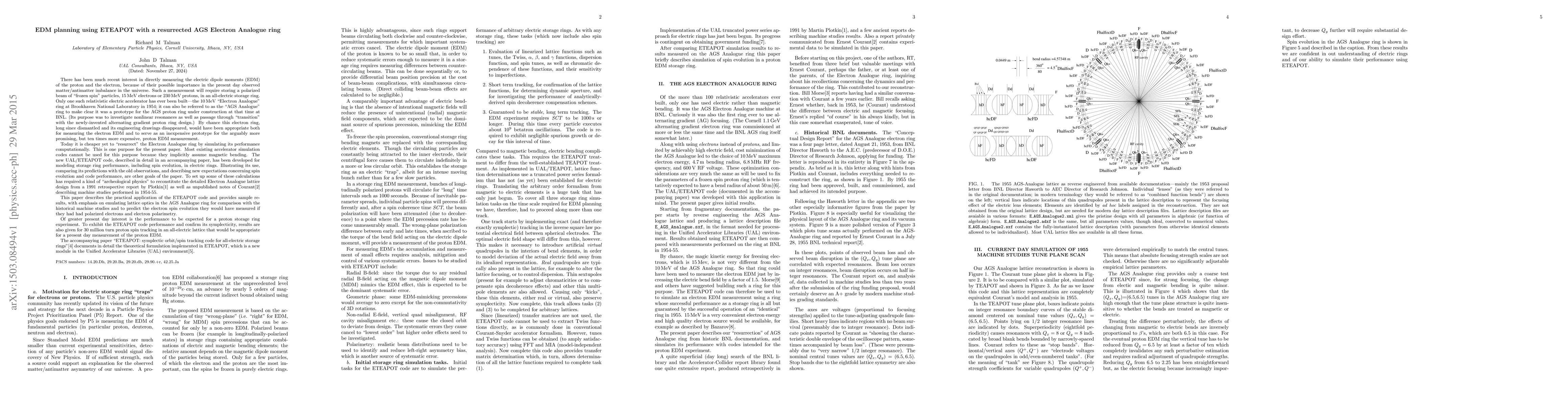 This paper applies the new UAL/ETEAPOT code to simulate the performance of a resurrected Electron Analogue ring, originally built in 1954, for measuring the electron's electric dipole moment (EDM). It also explores its potential for proton EDM measurements, comparing historical data with computational predictions.