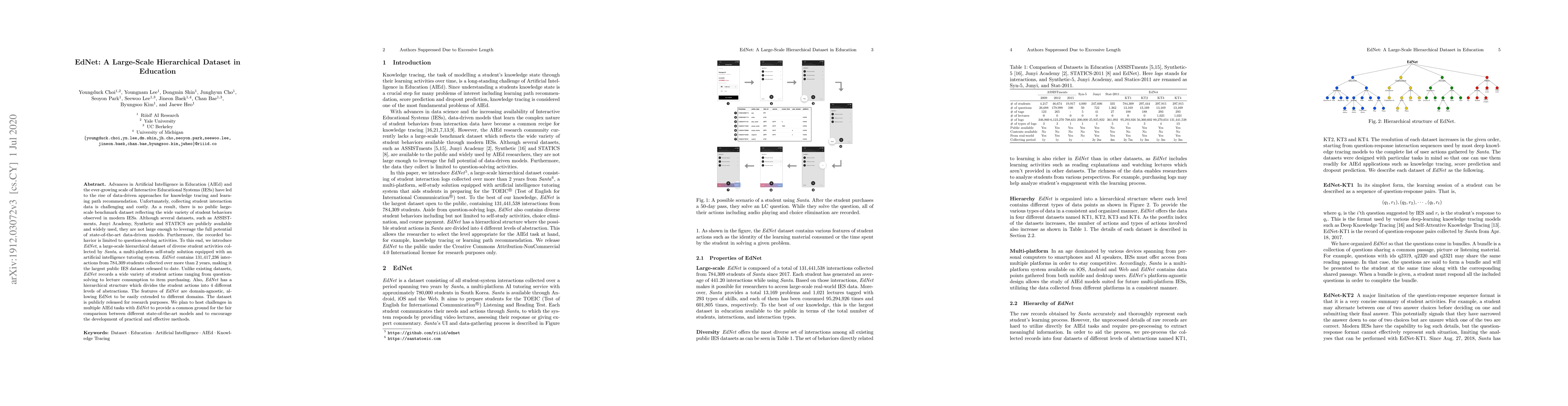 EdNet is a large-scale hierarchical dataset of diverse student interactions from Santa's multi-platform self-study solution, featuring 131 million interactions from over 784,000 students. Unlike existing datasets, EdNet captures a wide variety of student actions beyond question-solving and is publicly released to foster research in Artificial Intelligence in Education.