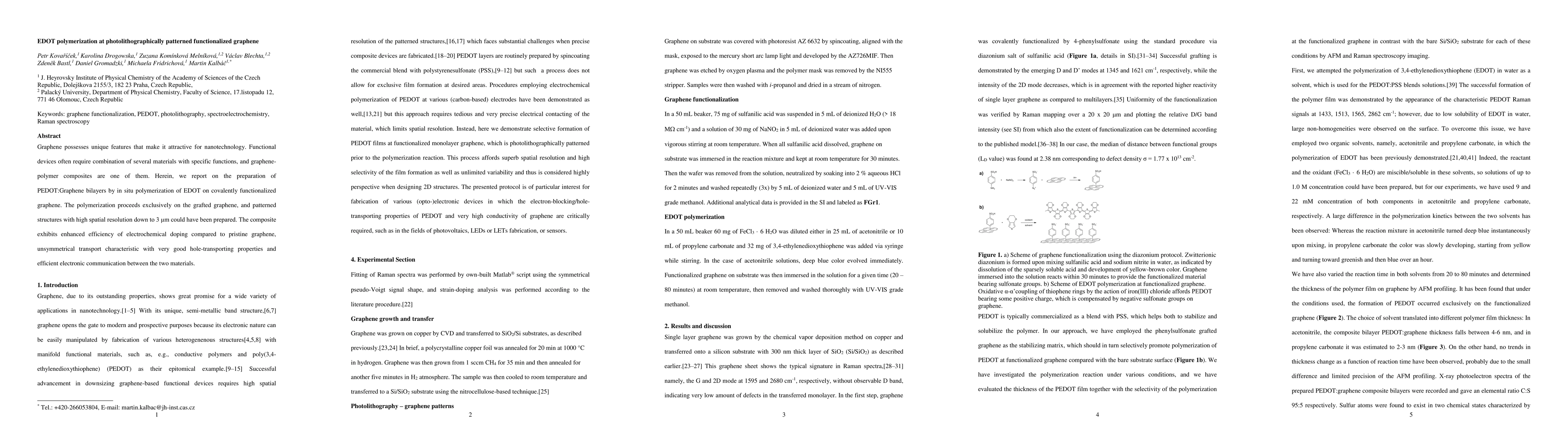 This paper details the in situ polymerization of EDOT on covalently functionalized graphene to create PEDOT:Graphene bilayers, achieving high-resolution patterned structures. The composite demonstrates improved electrochemical doping efficiency, asymmetrical transport characteristics, and efficient electronic interaction between PEDOT and graphene.