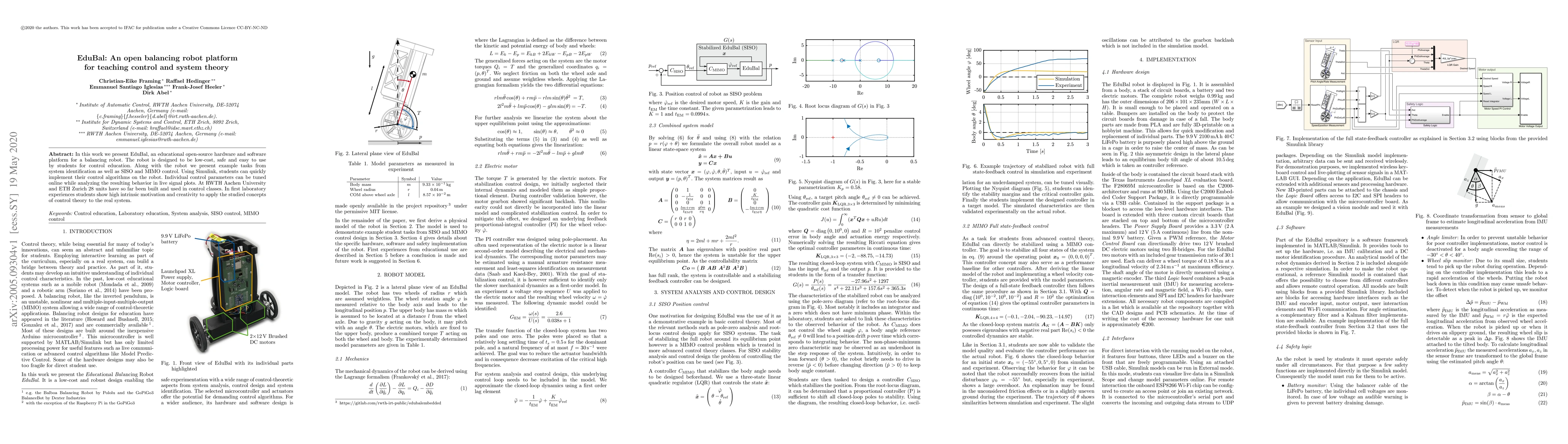 EduBal is an open-source platform that teaches control theory through a low-cost balancing robot, with students showing high motivation and creativity in applying concepts to the real system.