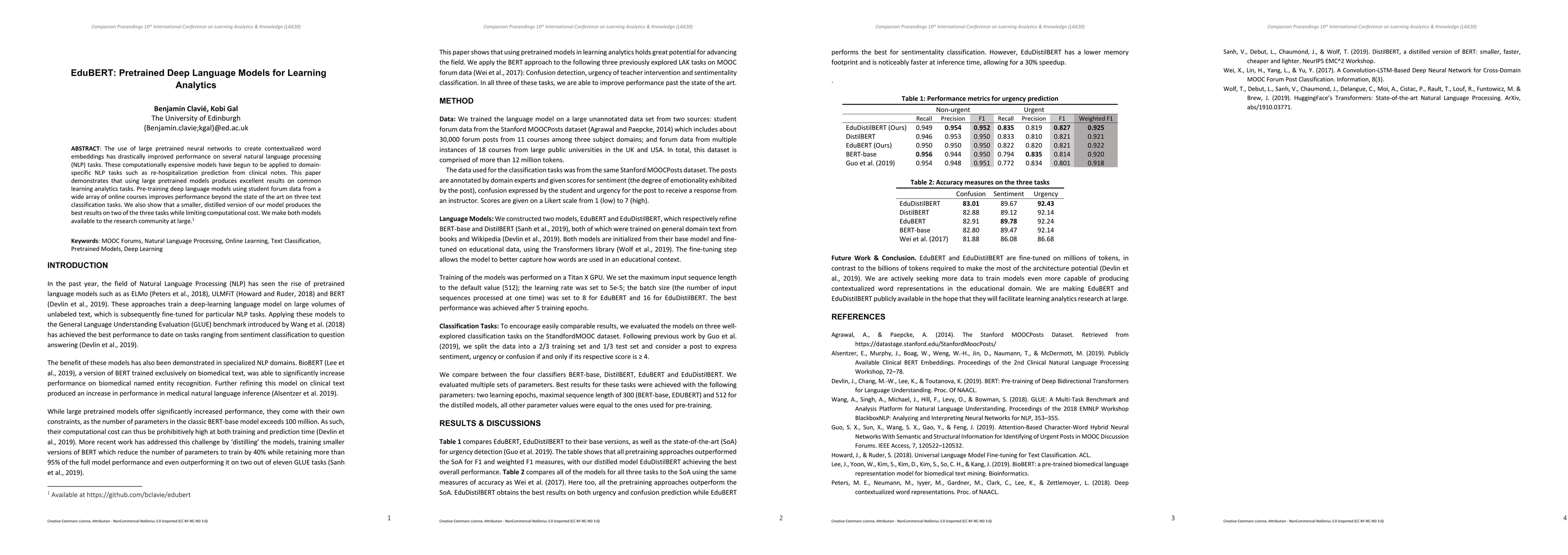 The development of EduBERT and EduDistilBERT, two pretrained deep language models for learning analytics tasks.