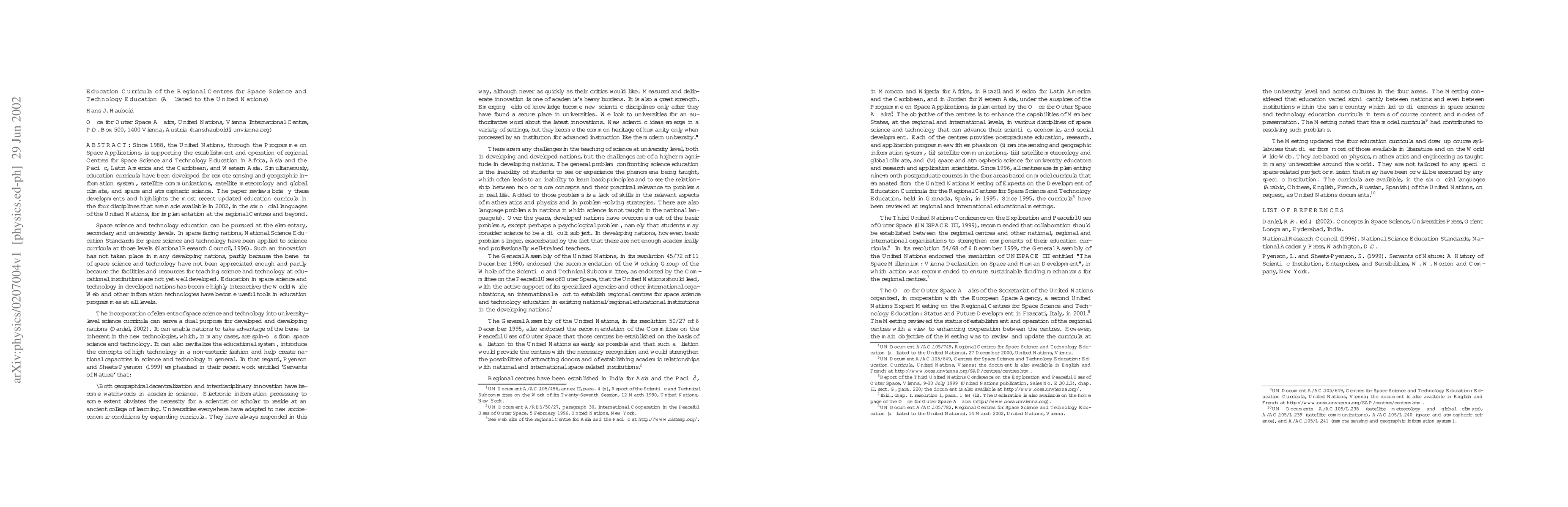 Since 1988, the United Nations, through the Programme on Space Applications, is supporting the establishment and operation of regional Centres for Space Science and Technology Education in Africa, Asia and the Pacific, Latin America and the Caribbean, and Western Asia. Simultaneously, education curricula have been developed for remote sensing and geographic information system, satellite communications, satellite meteorology and global climate, and space and atmospheric science. The paper reviews briefly these developments and highlights the most recent updated education curricula in the four disciplines that are made available in 2002, in the six official languages of the United Nations, for implementation at the regional Centres and beyond.