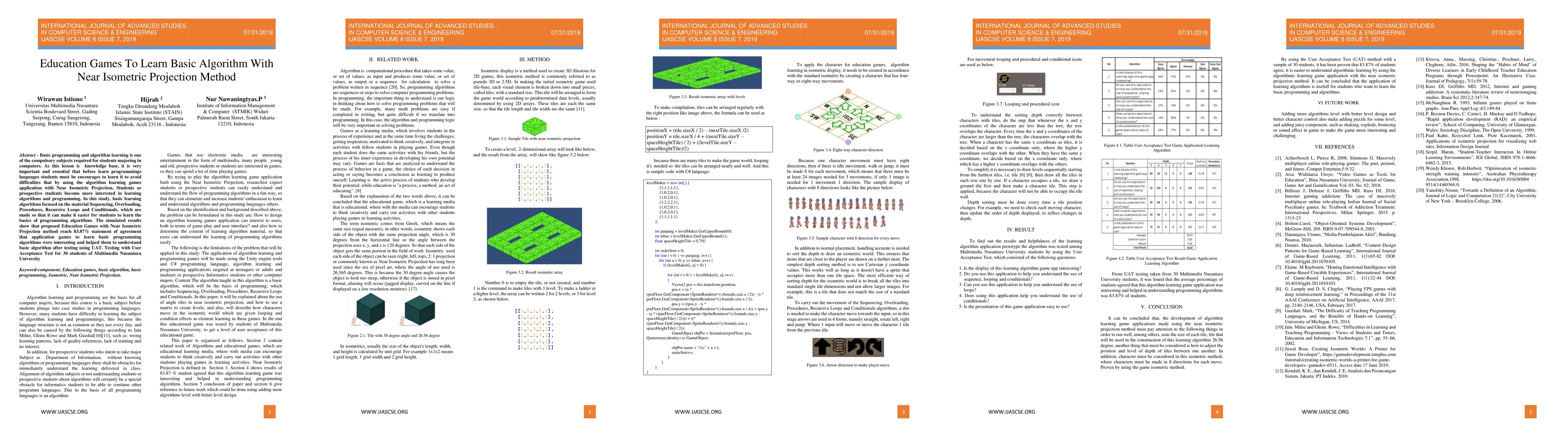 This study developed education games using Near Isometric Projection to teach basic programming algorithms, achieving 83.87% agreement among students that the games were interesting and helpful. The games focused on sequencing, overloading, procedures, recursive loops, and conditionals.