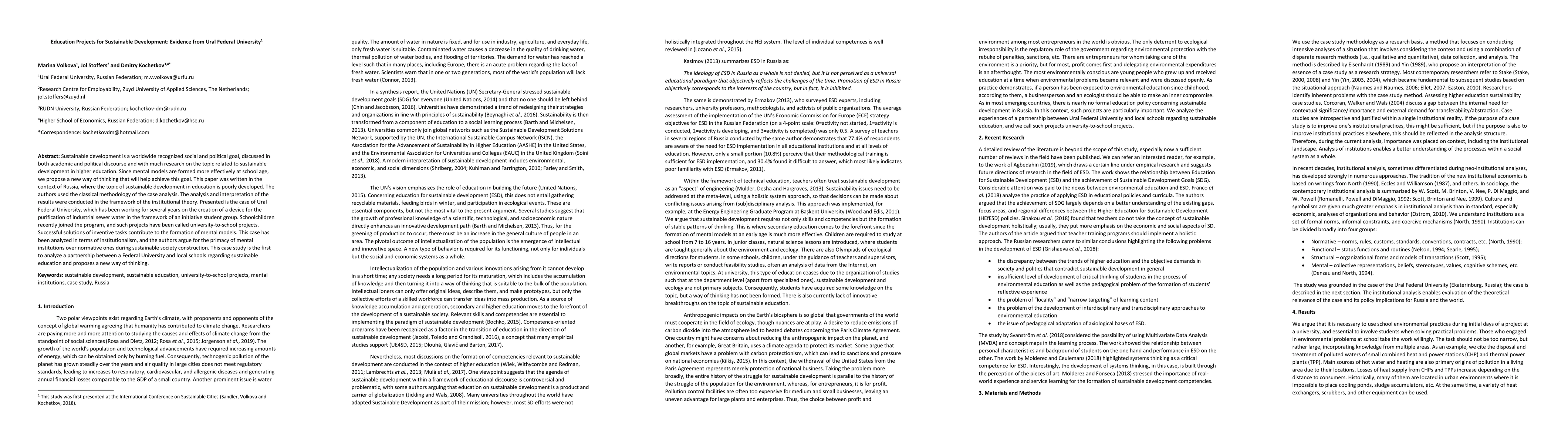 Sustainable development is a worldwide recognized social and political goal, discussed in both academic and political discourse and with much research on the topic related to sustainable development in higher education. Since mental models are formed more effectively at school age, we propose a new way of thinking that will help achieve this goal. This paper was written in the context of Russia, where the topic of sustainable development in education is poorly developed. The authors used the classical methodology of the case analysis. The analysis and interpretation of the results were conducted in the framework of the institutional theory. Presented is the case of Ural Federal University, which has been working for several years on the creation of a device for the purification of industrial sewer water in the framework of an initiative student group. Schoolchildren recently joined the program, and such projects have been called university-to-school projects. Successful solutions of inventive tasks contribute to the formation of mental models. This case has been analyzed in terms of institutionalism, and the authors argue for the primacy of mental institutions over normative ones during sustainable society construction. This case study is the first to analyze a partnership between a Federal University and local schools regarding sustainable education and proposes a new way of thinking.