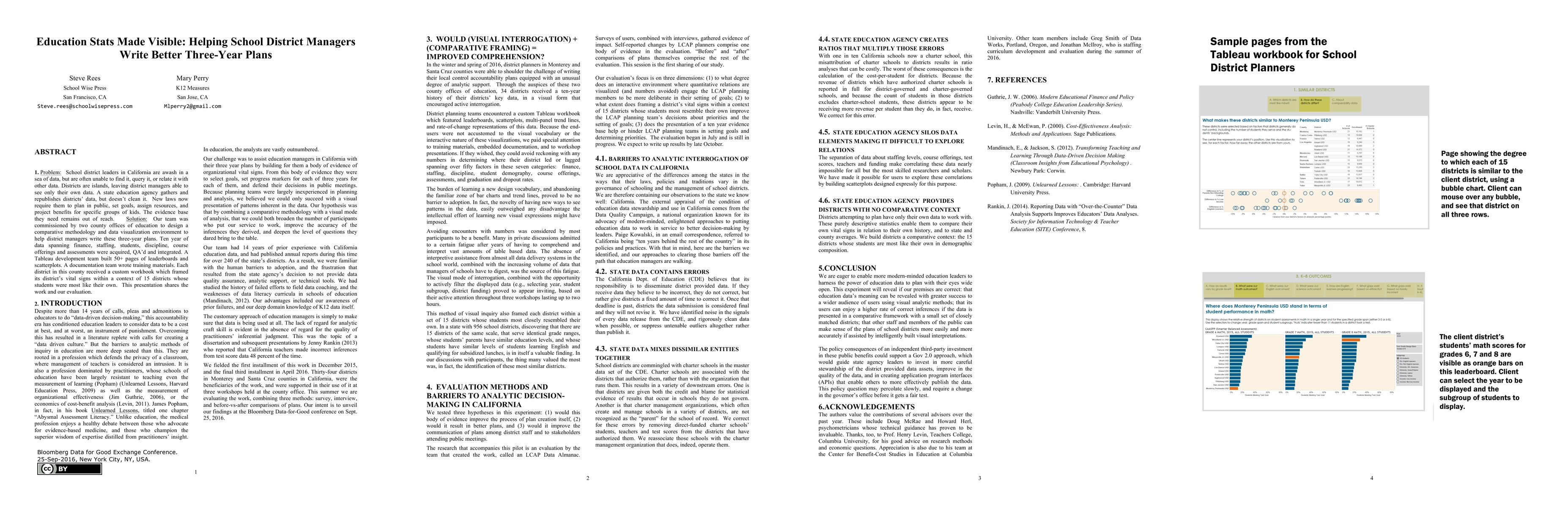 Problem: School district leaders in California are awash in a sea of data, but are often unable to find it, query it, or relate it with other data. Districts are islands, leaving district managers able to see only their own data. A state education agency gathers and republishes districts' data, but doesn't clean it. New laws now require them to plan in public, set goals, assign resources, and project benefits for specific groups of kids. The evidence base they need remains out of reach. Solution: Our team was commissioned by two county offices of education to design a comparative methodology and data visualization environment to help district managers write these three-year plans. Ten year of data spanning finance, staffing, students, discipline, course offerings and assessments were acquired, QA'd and integrated. A Tableau development team built 50+ pages of leaderboards and scatterplots. A documentation team wrote training materials. Each district in this county received a custom workbook which framed its district's vital signs within a context of 15 districts whose students were most like their own. This presentation shares the work and our evaluation.