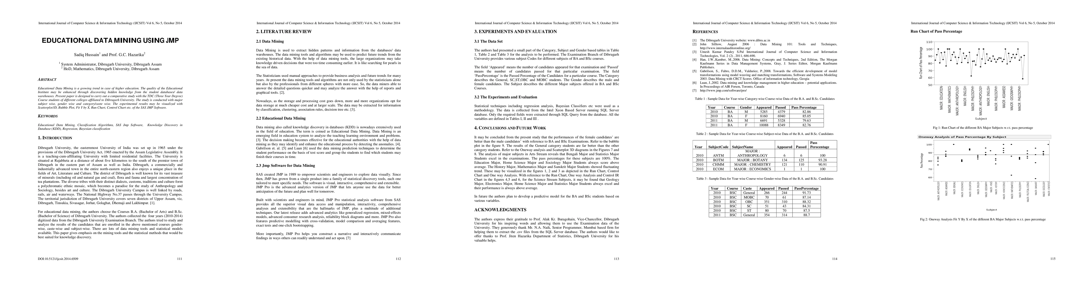 This paper explores educational data mining to enhance the quality of higher education by extracting insights from student databases. It conducts a comparative study on TDC Course students using SAS JMP software, visualizing results through various plots like Scatterplot3D and Control Chart.