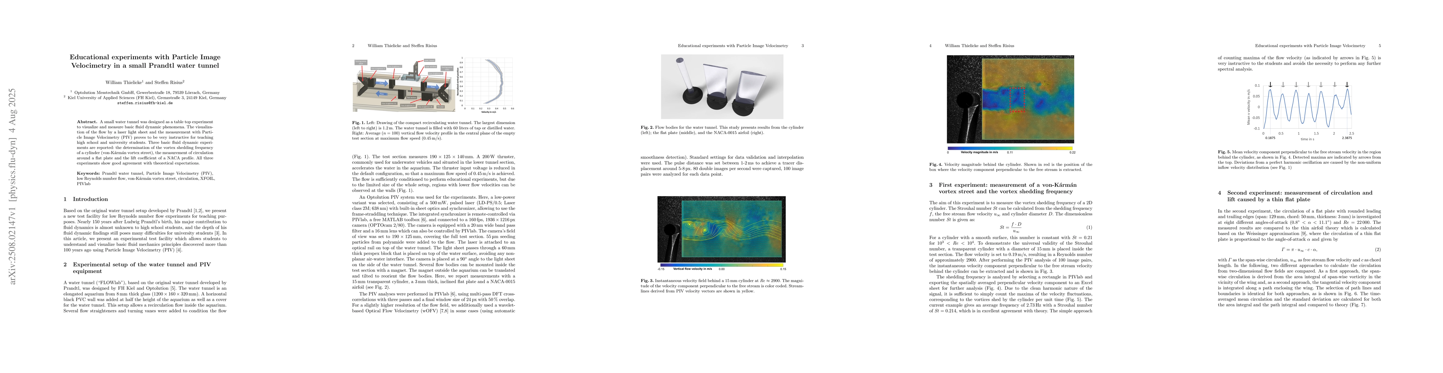 A small water tunnel was designed as a table top experiment to visualize and measure basic fluid dynamic phenomena. The visualization of the flow by a laser light sheet and the measurement with Particle Image Velocimetry (PIV) proves to be very instructive for teaching high school and university students. Three basic fluid dynamic experiments are reported: the determination of the vortex shedding frequency of a cylinder (von-Karman vortex street), the measurement of circulation around a flat plate and the lift coefficient of a NACA profile. All three experiments show good agreement with theoretical expectations.