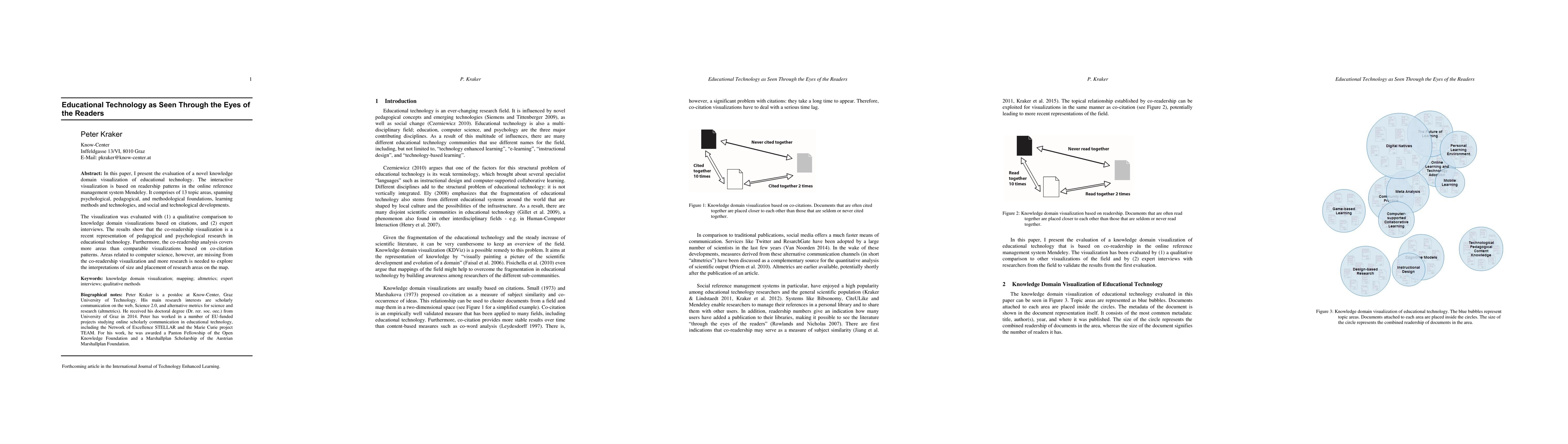 In this paper, I present the evaluation of a novel knowledge domain visualization of educational technology. The interactive visualization is based on readership patterns in the online reference management system Mendeley. It comprises of 13 topic areas, spanning psychological, pedagogical, and methodological foundations, learning methods and technologies, and social and technological developments. The visualization was evaluated with (1) a qualitative comparison to knowledge domain visualizations based on citations, and (2) expert interviews. The results show that the co-readership visualization is a recent representation of pedagogical and psychological research in educational technology. Furthermore, the co-readership analysis covers more areas than comparable visualizations based on co-citation patterns. Areas related to computer science, however, are missing from the co-readership visualization and more research is needed to explore the interpretations of size and placement of research areas on the map.